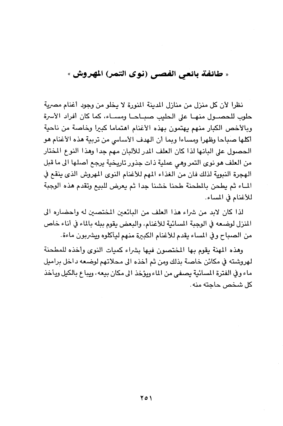 نظرا لأن كل منزل من منازل المدينة المنورة لا يخلو من وجود اغنام مصرية حلوب للحصول منها على الحليب صباحا ومساء، كما كان افراد الاسرة وبالاخص الكبار منهم يهتمون بهذه الأغنام اهتماما كبيرا وخاصة من ناحية أكلها صباحا وظهرا ومساءا وبما أن الهدف الأساسي من تربية هذه الاغنام هو الحصول على البانها لذا كان العلف المدر للألبان مهم جدا وهذا النوع المختار من العلف هو نوى التمر وهي عملية ذات جذور تاريخية يرجع أصلها الى ماقبل الهجرة النبوية لذلك فان من الغذاء المهم للأغنام النوى المهروش الذي ينقع في الماء ثم يطحن بالمطحنة طحنا خشنا جدا ثم يعرض للبيع وتقدم هذه الوجبة للأغنام في المساء. لذا كان لابد من شراء هذا العلف من البائعين المختصين له واحضاره الى المنزل لوضعه في الوجبة المسائية للأغنام، والبعض يقوم ببله بالماء في أناء خاص من الصباح وفي المساء يقدم للأغنام الكبيرة منهم ليأكلوه ويشربون ماءة. وهذه المهنة يقوم بها مختصون فيها بشراء كميات النوى وأخذه للمطحنة لهروشته في مكائن خاصة بذلك ومن ثم أخذه الى محلاتهم لوضعه داخل براميل ماء وفي الفترة المسائية يصفى من الماء ويؤخذ الى مكان بيعه، ويباع بالكيل ويأخذ كل شخص حاجته منه.…