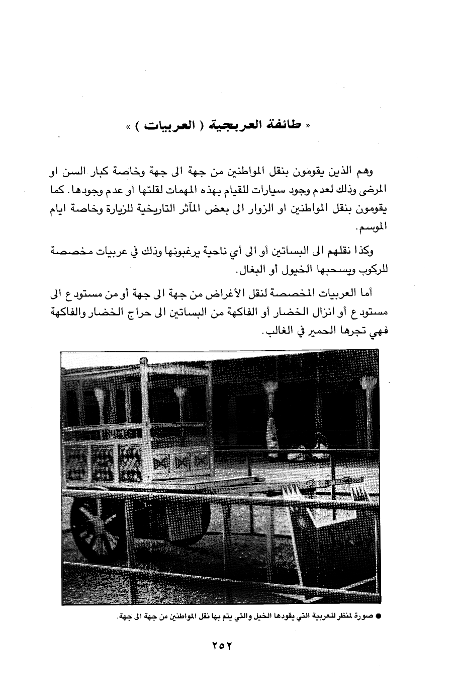 وهم الذين يقومون بنقل المواطنين من جهة الى جهة وخاصة كبار السن او المرضى وذلك لعدم وجود سيارات للقيام بهذه المهمات لقلتها او عدم وجودها. كما يقومون بنقل المواطنين او الزوار الى بعض المآثر التاريخية للزيارة وخاصة ايام الموسم. وكذا نقلهم الى البساتين او الى اي ناحية يرغبونها وذلك في عربيات مخصصة للركوب ويسحبها الخيول او البغال. أما العربيات المخصصة لنقل الأغراض من جهة الى جهة او من مستودع الى مستودع او انزال الخضار او الفاكهة من البساتين الى حراج الخضار والفاكهة فهي تجرها الحمير في الغالب. صورة لمنظر للعربية التي يقودها الخيل والتي يتم بها نقل المواطنين من جهة الى جهة.…