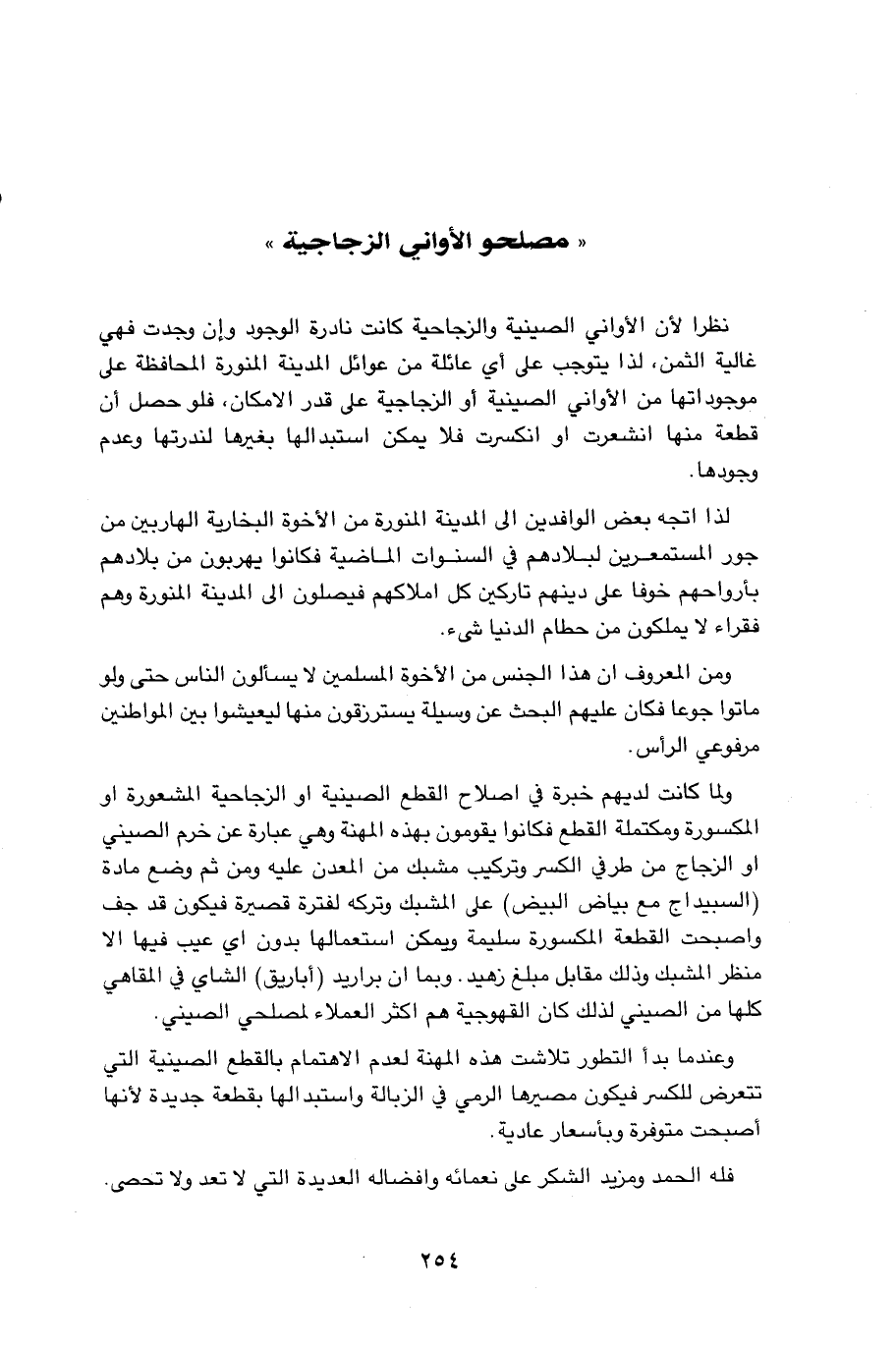 نظرا لأن الأواني الصينية والزجاحية كانت نادرة الوجود وان وجدت فهي غالية الثمن، لذا يتوجب على اي عائلة من عوائل المدينة المنورة المحافظة على موجوداتها من الاواني الصينية أو الزجاجية على قدر الامكان، فلو حصل أن قطعة منها انشعرت او انكسرت فلا يمكن استبدالها بغيرها لندرتها وعدم وجودها. لذا اتجه بعض الوافدين الى المدينة المنورة من الأخوة البخارية الهاربين من جور المستعمرين لبلادهم في السنوات الماضية فكانوا يهربون من بلادهم بأرواحهم خوفا على دينهم تاركين كل املاكهم فيصلون الى المدينة المنورة وهم فقراء لا يملكون من حطام الدنيا شىء. ومن المعروف ان هذا الجنس من الأخوة المسلمين لا يسألون الناس حتى ولو ماتوا جوعا فكان عليهم البحث عن وسيلة يسترزقون منها ليعيشوا بين المواطنين مرفوعي الرأس. ولما كانت لديهم خبرة في اصلاح القطع الصينية او الزجاحية المشعورة او المكسورة ومكتملة القطع فكانوا يقومون بهذه المهنة وهي عبارة عن خرم الصيني او الزجاج من طرفي الكسر وتركيب مشبك من المعدن عليه ومن ثم وضع مادة (السبيداج مع بياض البيض) على الشبك وتركه لفترة قصيرة فيكون قد جف واصبحت القطعة المكسورة سليمة ويمكن استعمالها بدون اي عيب فيها الا منظر المشبك وذلك مقابل مبلغ زهيد. وبما ان براريد (أباريق) الشاي في المقاهي كلها من الصيني لذلك كان القهوجية هم اكثر العملاء لمصلحي الصيني. وعندما بدأ التطور تلاشت هذه المهنة لعدم الاهتمام بالقطع الصينية التي تتعرض للكسر فيكون مصيرها الرمي في الزبالة واستبدالها بقطعة جديدة لأنها أصبحت متوفرة وبأسعار عادية. فله الحمد ومزيد الشكر على نعمائه وافضاله العديدة التي لا تعد ولا تحصى.…