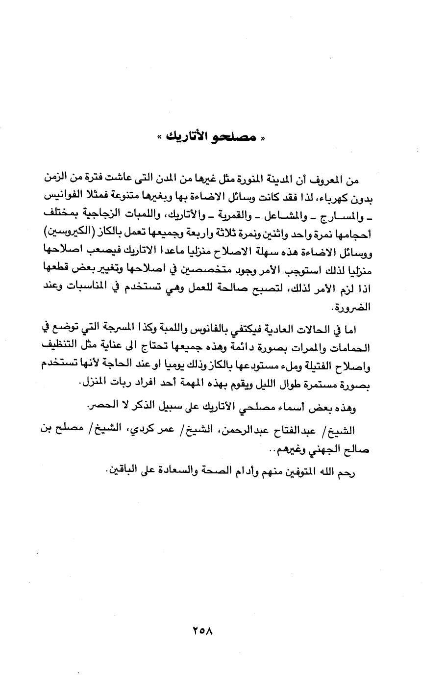 من المعروف ان المدينة المنورة مثل غيرها من المدن التى عاشت فترة من الزمن بدون كهرباء، لذا فقد كانت وسائل الاضاءة بها وبغيرها متنوعة فمثلا الفوانيس ـ والمسارج ـ والمشاعل ـ والقمرية ـ والأتاريك، واللمبات الزجاجية بمختلف احجامها نمرة واحد واثنين ونمرة وثلاثة واربعة وجميعها تعمل بالكاز (الكيروسين) ووسائل الاضاءة هذه سهلة الاصلاح منزليا ماعدا الاتاريك فيصعب اصلاحها منزليا لذلك استوجب الأمر وجود متخصصين في اصلاحها وتغيير بعض قطعها اذا لزم الأمر لذلك، لتصبح صالحة للعمل وهي تستخدم في المناسبات وعند الضرورة. اما في الحالات العادية فيكتفي بالفانوس واللمبة وكذا المسرجة التي توضع في الحمامات والممرات بصورة دائمة وهذه جميعها تحتاج الى عناية مثل التنظيف واصلاح الفتيلة وملء مستودعها بالكاز وذلك يوميا او عند الحاجة لأنها تستخدم بصورة مستمرة طوال الليل ويقوم بهذه المهمة أحد أفراد ربات المنزل. وهذه بعض اسماء مصلحي الأتاريك على سبيل الذكر لا الحصر. الشيخ / عبد الفتاح عبد الرحمن، الشيخ / عمر كردي، الشيخ / مصلح بن صالح الجهني وغيرهم. . رحم الله المتوفين منهم وأدام الصحة والسعادة على الباقين.…