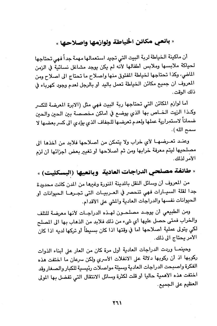 أن ماكينة الخياطة لربة البيت التي تجيد استعمالها مهمة جداً فهي تحتاجها لحكاية ملابسها وملابس أطفالها لأنه لم يكن يوجد مشاغل نسائية في الزمن الماضي، وكذا تحتاجها لخياطة المفتوق منها واصلاح ما تحتاج الى اصلاح ومن المعروف ان جميع مكائن الخياطة تعمل باليد او بالرجل لعدم وجود كهرباء في ذلك الوقت. اما لوازم المكائن التي تحتاجها ربة البيت فهي مثل (الابرة المعرضة للكسر وكذا الزيت الخاص بها الذي يوضع في اماكن مخصصة بين الحين والحين ضماناً لاستمرارية عملها ولعدم تعرضها للجفاف الذي يؤدي الى كسر بعضها لا سمح الله). وعند تعرضها لأي خراب ولا يتمكن من اصلاحها فلابد من اخذها الى مصلحيها ليتم معرفة خرابها ومن ثم اصلاحها او تغيير بعض اجزائها ان لزم الأمر لذلك.