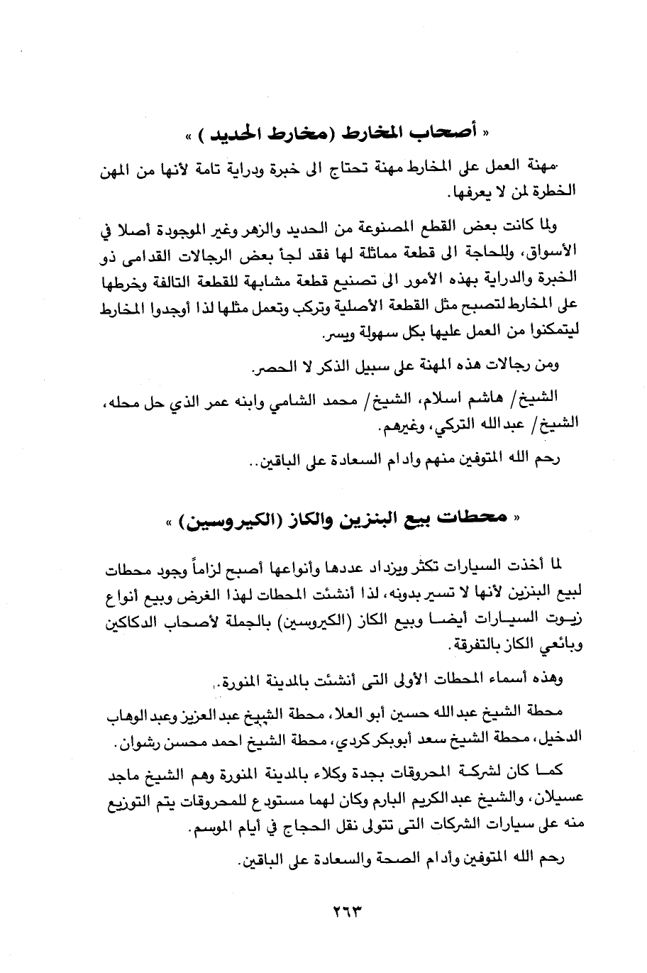 لما اخذت السيارات تكثر ويزداد عددها وأنواعها أصبح لزاماً وجود محطات لبيع البنزين لأنها لا تسير بدونه، لذا انشئت المحطات لهذا الغرض وبيع أنواع زيوت السيارات ايضا وبيع الكاز (الكيروسين) بالجملة لاصحاب الدكاكين وبائعي الكاز بالتفرقة. وهذه اسماء المحطات الاولى التى أنشئت بالمدينة المنورة. محطة الشيخ عبد الله حسين ابو العلا، محطة الشيخ عبد العزيز وعبد الوهاب الدخيل، محطة الشيخ سعد ابو بكر كردي، محطة الشيخ احمد محسن رشوان. كما كان لشركة المحروقات بجدة وكلاء بالمدينة المنورة وهم الشيخ ماجد عسيلان، والشيخ عبد الكريم البارم وكان لهما مستودع للمحروقات يتم التوزيع منه على سيارات الشركات التى تتولى نقل الحجاج في أيام الموسم. رحم الله المتوفين وادام الصحة والسعادة على الباقين.…