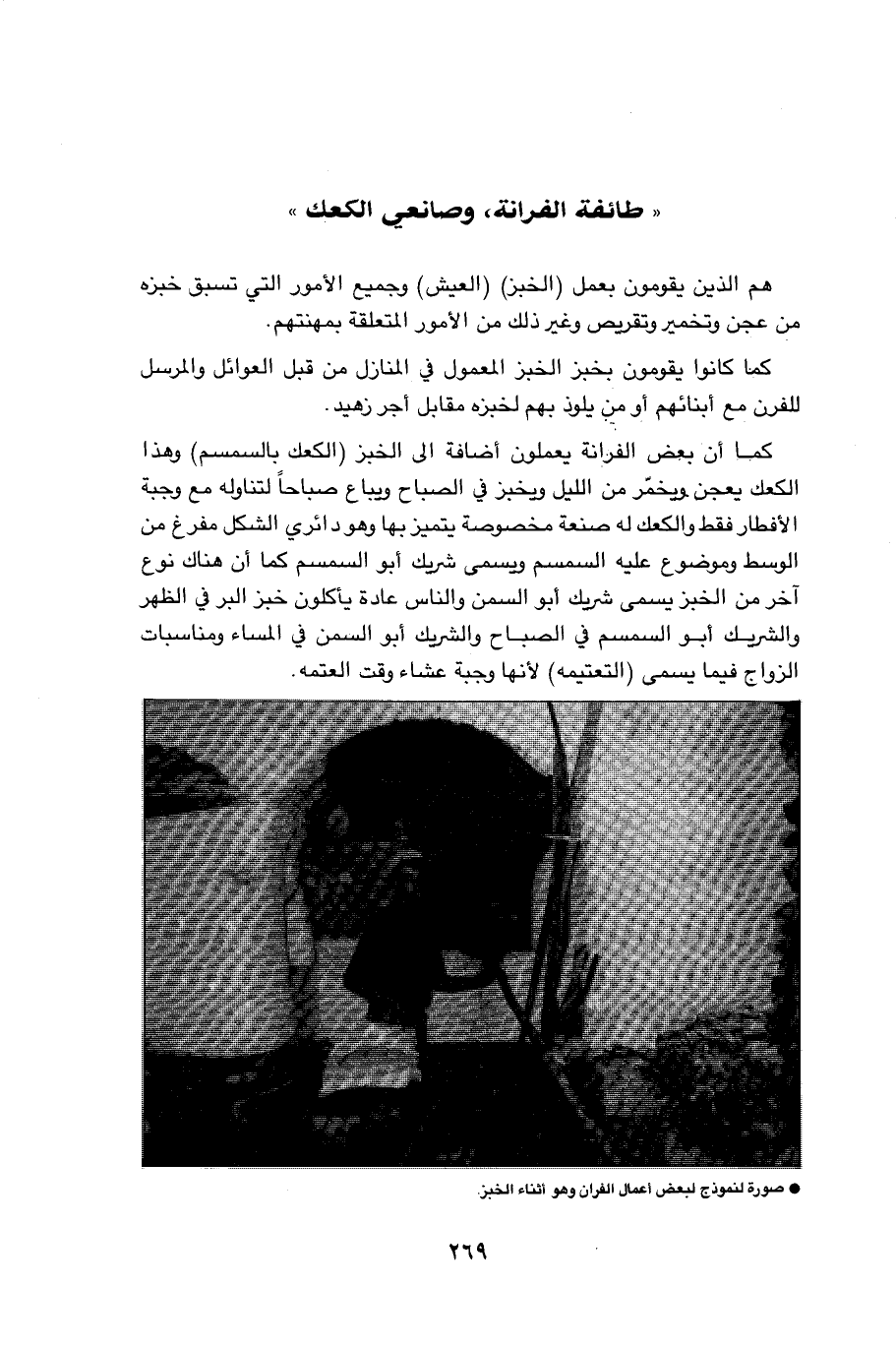 كما كانوا يقومون بخبز الخبز المعمول في المنازل من قبل العوائل والمرسل للفرن مع ابنائهم أو من يلوذ بهم لخبزه مقابل أجر زهيد. كما أن بعض الفرانة يعملون أضافة الى الخبز (الكعك بالسمسم) وهذا الكعك يعجن ويخمر من الليل ويخبز في الصباح ويباع صباحاً لتناوله مع وجبة الأفطار فقط والكعك له صنعة مخصوصة يتميز بها وهو دائري الشكل مفرغ من الوسط وموضوع عليه السمسم ويسمى شريك ابو السمسم كما ان هناك نوع آخر من الخبز يسمى شريك أبو السمن والناس عادة يأكلون خبز البر في الظهر والشريك ابو السمسم في الصباح والشريك ابو السمن في المساء ومناسبات الزواج فيما يسمى (التعتيمه) لأنها وجبة عشاء وقت العتمه. صورة لنموذج لبعض اعمال الفران وهو اثناء الخبز.…