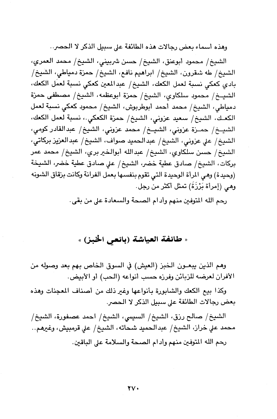 270…وهذه أسماء بعض رجالات هذه الطائفة على سبيل الذكر لا الحصر. . الشيخ / محمود أبو عنق، الشيخ / حسن شربيني، الشيخ / محمد العمري، الشيخ / طه شقرون، الشيخ / ابراهيم نافع، الشيخ / حمزة دمياطي، الشيخ / بادي كعكي نسبة لعمل الكعك، الشيخ / عبد المعين كعكي نسبة لعمل الكعك، الشيخ / محمود سلكاوي، الشيخ / حمزة ابو عظمه، الشيخ / مصطفى حمزة دمياطي، الشيخ / محمد احمد ابوطربوش، الشيخ / محمود كعكي نسبة لعمل الكعك، الشيخ / سعيد عزوني، الشيخ / حمزة الكعكي.، نسبة لعمل الكعك، الشيخ / حمزة عزوني، الشيخ / محمد عزوني، الشيخ / عبد القادر كومي، الشيخ / علي عزوني، الشيخ / عبد الحميد صواف، الشيخ / عبد العزيز بركاتي، الشيخ / حسن سلكاوي، الشيخ / عبد الله ابو الخير بري، الشيخ / محمد عمر بركات، الشيخ / صادق عطية خضر، الشيخ / علي صادق عطية خضر، الشيخة (وحيدة) وهي المرأة الوحيدة التي تقوم بنفسها بعمل الفرانة وكانت بزقاق الشونة وهي (إمرأة برزة) تمثل أكثر من رجل. رحم الله المتوفين منهم وادام الصحة والسعادة على من بقى.