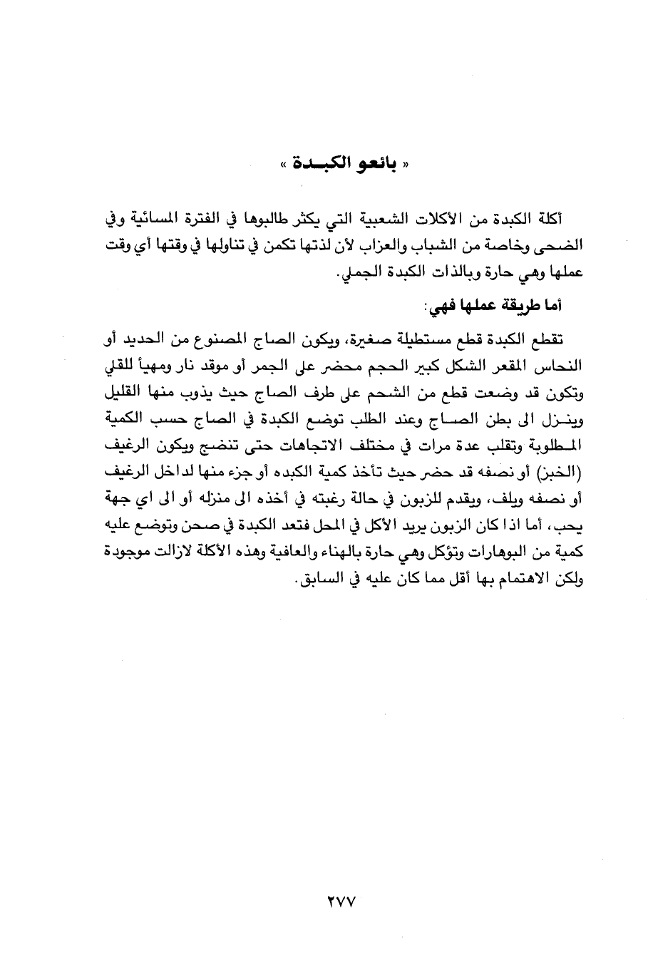 تقطع الكبدة قطع مستطيلة صغيرة، ويكون الصاج المصنوع من الحديد أو النحاس المقعر الشكل كبير الحجم محضر على الجمر أو موقد نار ومهيأ للقلي وتكون قد وضعت قطع من الشحم على طرف الصاج حيث يذوب منها القليل وينزل الى بطن الصاج وعند الطلب توضع الكبدة في الصاج حسب الكمية المطلوبة وتقلب عدة مرات في مختلف الاتجاهات حتى تنضج ويكون الرغيف (الخبز) أو نصفه قد حضر حيث تأخذ كمية الكبدة أو جزء منها لداخل الرغيف أو نصفه ويلف، ويقدم للزبون في حالة رغبته في أخذه الى منزله أو الى اي جهة يحب، اما اذا كان الزبون يريد الأكل في المحل فتعد الكبدة في صحن وتوضع عليه كمية من البوهارات وتؤكل وهي حارة بالهناء والعافية وهذه الأكلة لازالت موجودة ولكن الاهتمام بها اقل مما كان عليه في السابق.…