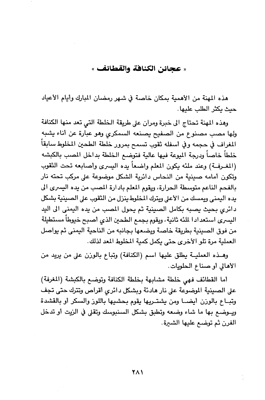 هذه المهنة من الأهمية بمكان خاصة في شهر رمضان المبارك وأيام الأعياد حيث يكثر الطلب عليها. وهذه المهنة تحتاج الى خبرة ومران على طريقة الخلطة التي تعد منها الكنافة ولها مصب مصنوع من الصفيح يصنعه السمكري وهو عبارة عن اناء يشبه المغراف في حجمه وفي أسفله ثقوب تسمح بمرور خلطة الطحين المخلوط سابقاً خلطاً خاصا ودرجة الميوعة فيها عالية فتوضع الخلطة بداخل المصب بالكبشة (المغرفة) وعند ملئه يكون المعلم واضعاً يده اليسرى واصابعه تحت الثقوب وتكون أمامه صينية من النحاس دائرية الشكل موضوعة على مركب تحته نار بالفحم الناعم متوسطة الحرارة، ويقوم المعلم بادراة المصب من يده اليسرى الى يده اليمنى ويمسك من الأعلى ويترك المخلوط ينزل من الثقوب على الصينية بشكل دائري بحيث يصبه بكامل الصينية ثم يحول المصب من يده اليمنى الى اليد اليسرى استعدادا لملئه ثانية، ويقوم بجمع الطحين الذي أصبح خيوطاً مستطيلة من فوق الصينية بطريقة خاصة ويضعها بجانبه من الناحية اليمنى ثم يواصل العملية مرة تلو الأخرى حتى يكمل كمية المخلوط المعد لذلك. وهذه العملية يطلق عليها اسم (الكنافة) وتباع بالوزن على من يريد من الأهالي أو صناع الحلويات. أما القطائف فهي خلطة مشابهة بخلطة الكنافة وتوضع بالكبشة (المغرفة) على الصينية الموضوعة على نار هادئة وبشكل دائري أقراص وتترك حتى تجف وتباع بالوزن أيضا ومن يشتريها يقوم بحشيها باللوز والسكر أو بالقشدة ويوضع بها ما شاء وضعه وتطبق بشكل السنبوسك وتقلى في الزيت أو تدخل الفرن ثم توضع عليها الشيرة.…