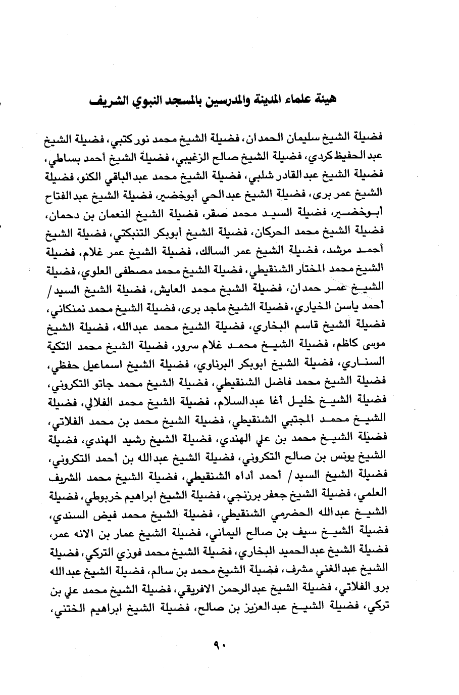 90…هيئة علماء المدينة والمدرسين بالمسجد النبوي الشريف فضيلة الشيخ سليمان الحمدان، فضيلة الشيخ محمد نور كتبي، فضيلة الشيخ عبد الحفيظ كردي، فضيلة الشيخ صالح الزغيبي، فضيلة الشيخ أحمد بساطي، فضيلة الشيخ عبد القادر شلبي، فضيلة الشيخ محمد عبد الباقي كنو، فضيلة الشيخ عمر برى، فضيلة الشيخ عبد الحي ابو خضير، فضيلة الشيخ عبد الفتاح أبو خضير، فضيلة السيد محمد صقر، فضيلة الشيخ النعمان بن دحمان، فضيلة الشيخ محمد الحركان، فضيلة الشيخ أبو بكر التنبكتي، فضيلة الشيخ أحمد مرشد، فضيلة الشيخ عمر السالك، فضيلة الشيخ عمر غلام فضيلة الشيخ محمد المختار الشنقيطي، فضيلة الشيخ محمد مصطفى العلوي، فضيلة الشيخ عمر حمدان، فضيلة الشيخ محمد العايش، فضيلة الشيخ السيد / أحمد ياسن الخياري، فضيلة الشيخ ماجد برى، فضيلة الشيخ محمد نمنكاني، فضيلة الشيخ قاسم البخاري، فضيلة الشيخ محمد عبد الله، فضيلة الشيخ موسى كاظم، فضيلة الشيخ محمد غلام سرور، فضيلة الشيخ محمد التكية السناري، فضيلة الشيخ ابو بكر البرناوي، فضيلة الشيخ اسماعيل حفظي، فضيلة الشيخ محمد فاضل الشنقيطي، فضيلة الشيخ محمد جاتو التكروني، فضيلة الشيخ خليل أغا عبد السلام، فضيلة الشيخ محمد الفلالي، فضيلة الشيخ محمد المجتبي الشنقيطي، فضيلة الشيخ محمد بن محمد الفلاتي، فضيلة الشيخ محمد بن علي الهندي، فضيلة الشيخ رشيد الهندي، فضيلة الشيخ يونس بن صالح التكروني، فضيلة الشيخ عبد الله بن أحمد التكروني، فضيلة الشيخ السيد / أحمد أداه الشنقيطي، فضيلة الشيخ محمد الشريف العلمي، فضيلة الشيخ جعفر برزنجي، فضيلة الشيخ ابراهيم خربوطي، فضيلة الشيخ عبد الله الحضرمي الشنقيطي، فضيلة الشيخ محمد فيض السندي، فضيلة الشيخ سيف بن صالح اليماني، فضيلة الشيخ عمار بن الانه عمر، فضيلة الشيخ عبد الحميد البخاري، فضيلة الشيخ محمد فوزي التركي، فضيلة الشيخ عبد الغني مشرف، فضيلة الشيخ محمد بن سالم، فضيلة الشيخ عبد الله برو الفلاتي، فضيلة الشيخ عبد الرحمن الافريقي، فضيلة الشيخ محمد علي بن تركي، فضيلة الشيخ عبد العزيز بن صالح، فضيلة الشيخ ابراهيم الختني،…