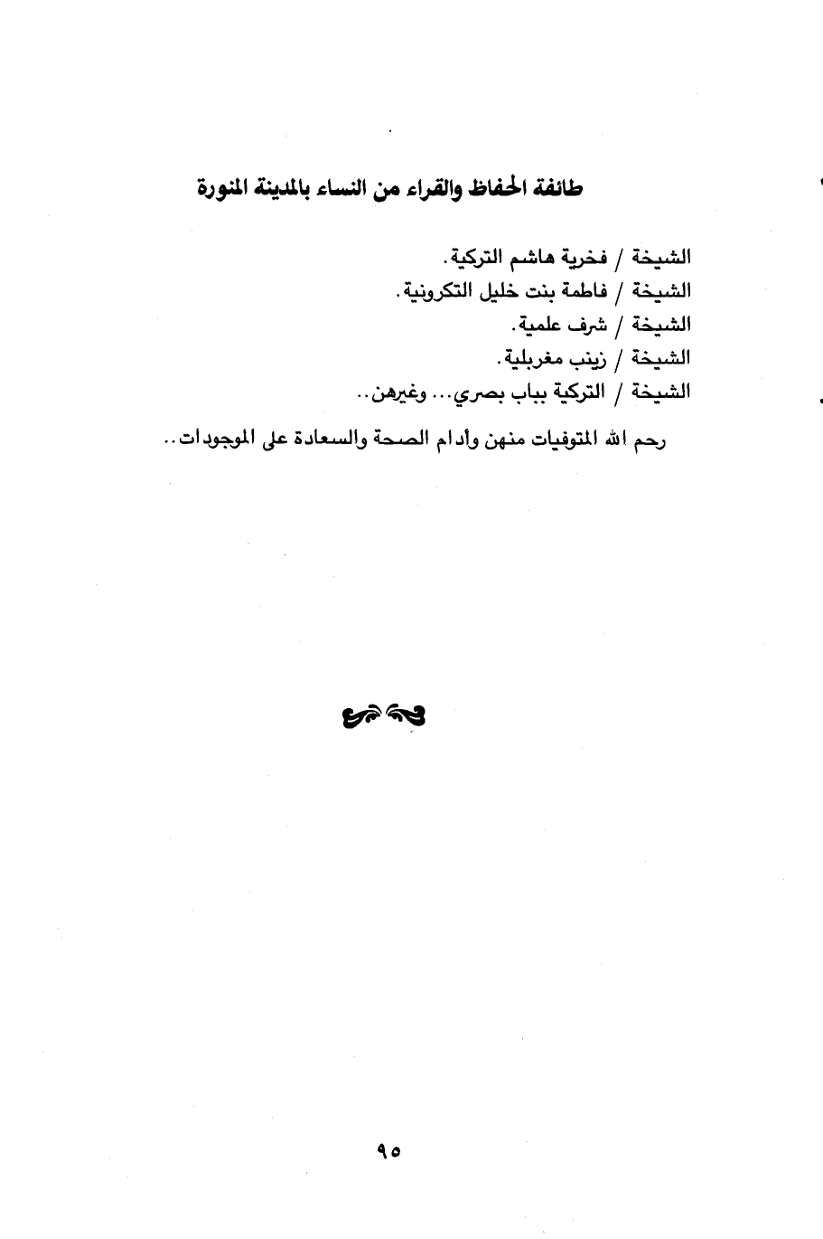 95…طائفة الحفاظ والقراء من النساء بالمدينة المنورة الشيخة / فخرية هاشم التركية. الشيخة / فاطمة بنت خليل التكرونية. الشيخة / شرف علمية. الشيخة / زينب مغربلية. الشيخة / التركية بباب بصري. . . وغيرهن. . رحم الله المتوفيات منهن وأدام الصحة والسعادة على الموجودات. .…