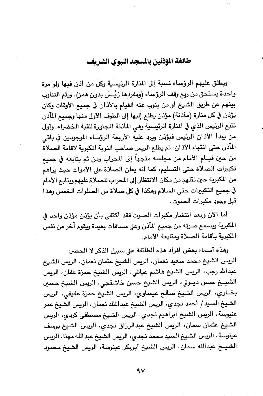97…طائفة المؤذنين بالمسجد النبوي الشريف ويطلق عليهم الرؤساء نسبة الى المنارة الرئيسية وكل من أذن فيها ولو مرة واحدة يستحق من ريع وقف الرؤساء (ومفردها ريس بدون همز). ويتم التناوب بينهم عن طريق الشيخ أو من ينوب عنه القيام بالأذان في جميع الأوقات وكان يؤذن في كل منارة (مأذنة) مؤذن يطلع اليها الى الطوف الاول منها وجميع المآذن تتبع الرئيس الذي في النارة الرئيسية وهي المأذنة المجاورة للقبة الخضراء، وأول من يبدأ الأذان الرئيس فيؤذن ويرد عليه الأربعة الرؤساء الموجودين في باقي المآذن حتى انتهاء الأذان، ثم يطلع الريس صاحب النوبة المكبرية لاقامة الصلاة من حين قيام الامام من مجلسه متجهاً إلى المحراب ومن ثم يتابعه في جميع تكبيرات الصلاة حتى التسليم، كما أنه يعلن الصلاة على الأموات حيث يراهم من المكبرية حين نقلهم من مكان الانتظار الى المحراب للصلاة عليهم ويتابع الأمام في جميع التكبيرات حتى السلام وهكذا في كل صلاة من الصلوات الخمس وهذا قبل وجود مكبرات الصوت. أما الآن وبعد انتشار مكبرات الصوت فقد أكتفى بأن يؤذن مؤذن واحد في المكبرية ويسمع صوته من جميع المآذن وعلى مسافات بعيدة ويقوم آخر من نفس المكبرية بإقامة الصلاة ومتابعة الأمام. وهذه أسماء بعض أفراد هذه الطائفة على سبيل الذكر لا الحصر: الريس الشيخ محمد سعيد نعمان، الريس الشيخ عثمان نعمان، الريس الشيخ عبد الله رجب، الريس الشيخ هاشم عياشي، الريس الشيخ حمزة عفان، الريس الشيخ حسن ديولي، الريس الشيخ حسن خاشقجي، الريس الشيخ حسين بخاري، الريس الشيخ صالح عيساوي، الريس الشيخ حمزة عفيفي، الريس الشيخ السيد / أحمد نجدي، الريس الشيخ عبد الملك نعمان، الريس الشيخ عمر عنيوسة، الريس الشيخ ابراهيم نجدي، الريس الشيخ مصطفى كردي، الريس الشيخ عثمان سمان، الريس الشيخ عبد الرزاق نجدي، الريس الشيخ يوسف عينوسة، الريس الشيخ السيد محمد نجدي، الريس الشيخ عبد الله مهنا، الريس الشيخ عبد الله سمان، الريس الشيخ أبو بكر عينوسة، الريس الشيخ محمود…