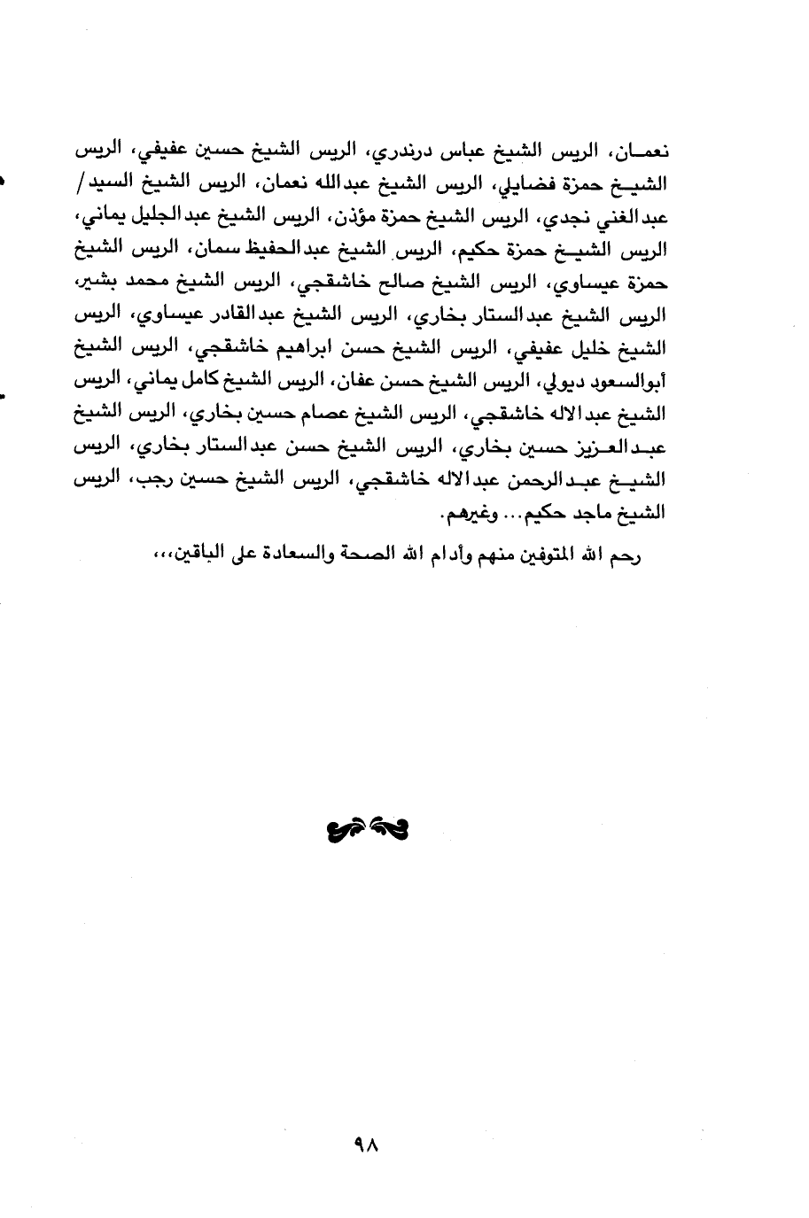 98…نعمان، الريس الشيخ عباس درندري، الريس الشيخ حسين عفيفي، الريس الشيخ حمزة فضايلي، الريس الشيخ عبد الله نعمان، الريس الشيخ السيد / عبد الغني نجدي، الريس الشيخ حمزة مؤذن، الريس الشيخ عبد الجليل يماني، الريس الشيخ حمزة حكيم، الريس الشيخ عبد الحفيظ سمان، الريس الشيخ حمزة عيساوي، الريس الشيخ صالح خاشقجي، الريس الشيخ محمد بشير، الريس الشيخ عبد الستار بخاري، الريس الشيخ عبد القادر عيساوي، الريس الشيخ خليل عفيفي، الريس الشيخ حسن ابراهيم خاشقجي، الريس الشيخ ابو السعود ديولي، الريس الشيخ حسن عفان، الريس الشيخ كامل يماني، الريس الشيخ عبد الاله خاشقجي، الريس الشيخ عصام حسين بخاري، الريس الشيخ عبد العزيز حسين بخاري، الريس الشيخ حسن عبد الستار بخاري، الريس الشيخ عبد الرحمن عبد الاله خاشقجي، الريس الشيخ حسين رجب، الريس الشيخ ماجد حكيم. . . وغيرهم. رحم الله المتوفين منهم وأدام الله الصحة والسعادة على الباقين،،،…