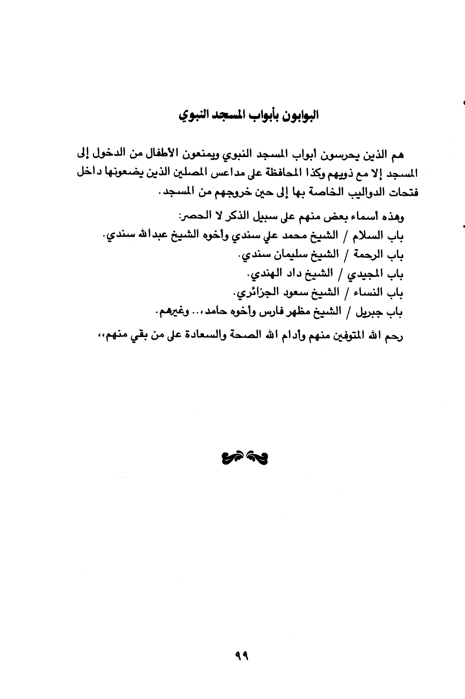 99…البوابون بأبواب المسجد النبوي هم الذين يحرسون ابواب المسجد النبوي ويمنعون الاطفال من الدخول إلى المسجد إلا مع ذويهم وكذا المحافظة على مداعس المصلين الذين يضعونها داخل فتحات الدواليب الخاصة بها إلى حين خروجهم من المسجد. وهذه أسماء بعض منهم على سبيل الذكر لا الحصر: باب السلام / الشيخ محمد علي سندي وأخوه الشيخ عبد الله سندي. باب الرحمة / الشيخ سليمان سندي. باب المجيدي / الشيخ داد الهندي. باب النساء / الشيخ سعود الجزائري. باب جبريل / الشيخ مظهر فارس وأخوه حامد،. . وغيرهم. رحم الله المتوفين منهم وأدام منهم الله الصحة والسعادة على من بقي منهم،،…