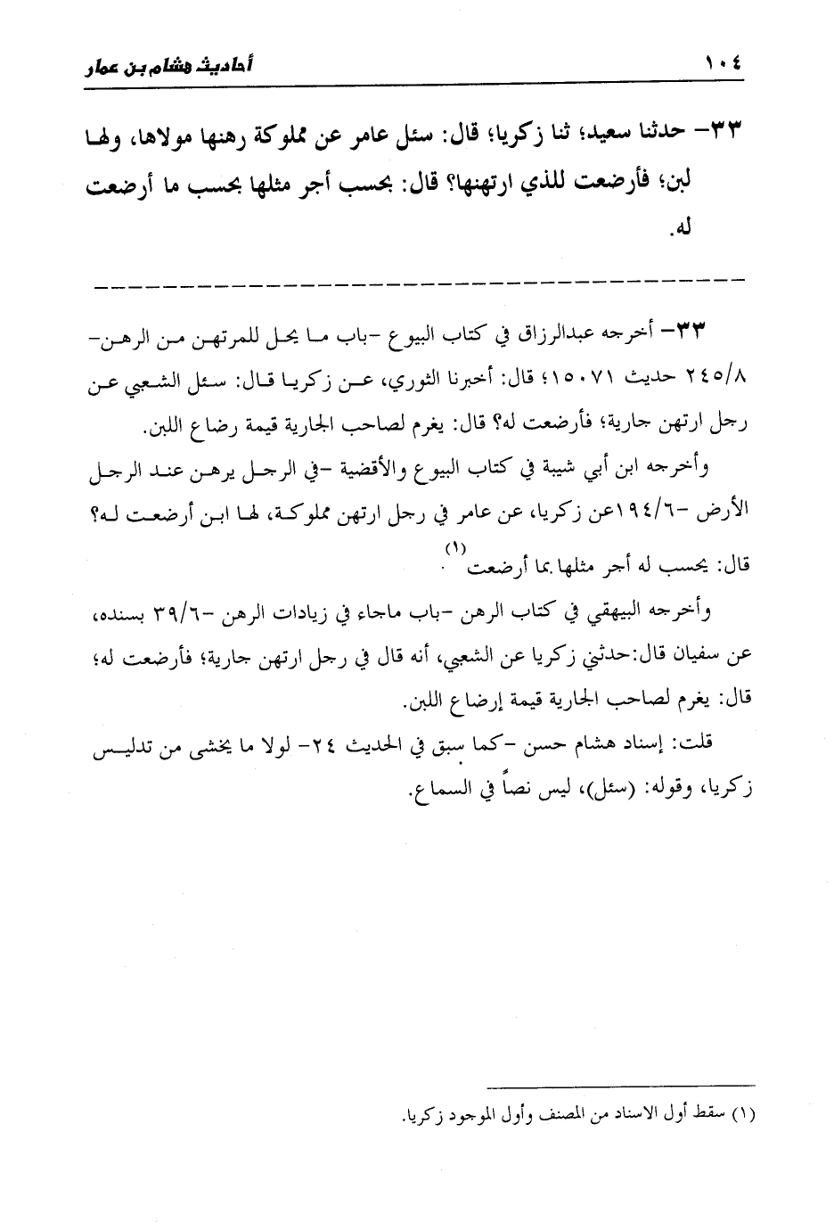 33 - حَدَّثَنَا سَعِيدٌ، ثنا زَكَرِيَّا قَالَ: سُئِلَ عَامِرٌ عَنْ مَمْلُوكَةٍ رَهَنَهَا مَوْلَاهَا، وَلَهَا لَبَنٌ فَأَرْضَعَتْ لِلَّذِي ارْتَهَنَهَا؟ قَالَ: «§بِحَسْبِ أَجْرِ مِثْلِهَا بِحَسْبِ مَا أَرْضَعَتْ لَهُ»