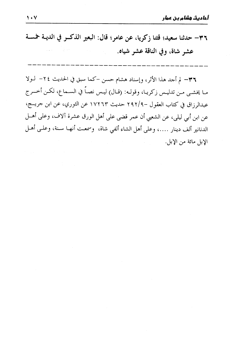 36 - حَدَّثَنَا سَعِيدٌ، قثنا زَكَرِيَّا، عَنْ عَامِرٍ قَالَ: «§الْبَعِيرُ الذَّكَرُ فِي الدِّيَةِ خَمْسَ عَشْرَةَ شَاةً، وَفِي النَّاقَةِ عَشْرُ شِيَاهٍ»