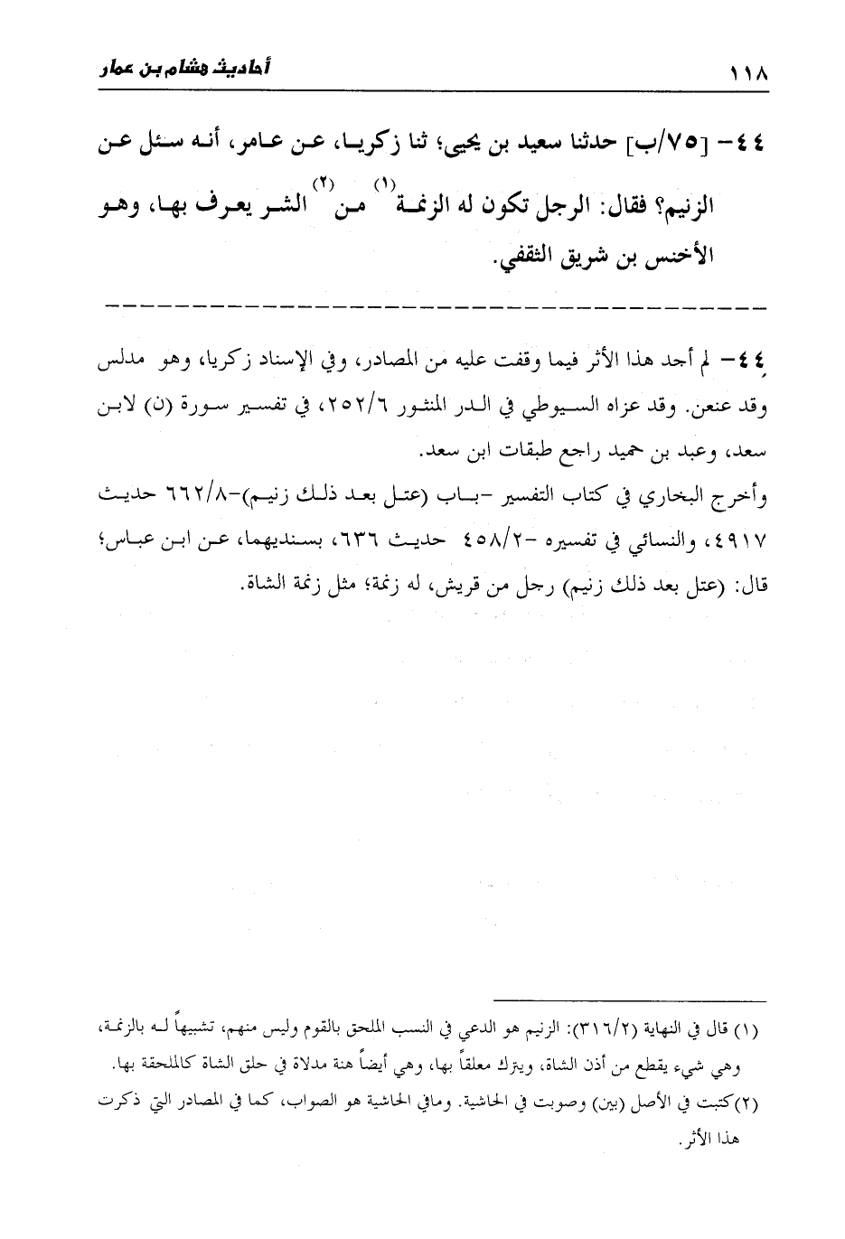 حَدَّثَنَا سَعِيدُ بْنُ يَحْيَى، ثنا زَكَرِيَّا، عَنْ عَامِرٍ أَنَّهُ سُئِلَ عَنِ الزَّنِيمِ فَقَالَ: «§الرَّجُلُ تَكُونُ لَهُ الزَّنَمَةُ مِنَ الشَّرِّ يُعْرَفُ بِهَا، وَهُوَ الْأَخْنَسُ بْنُ شَرِيقٍ الثَّقَفِيُّ»