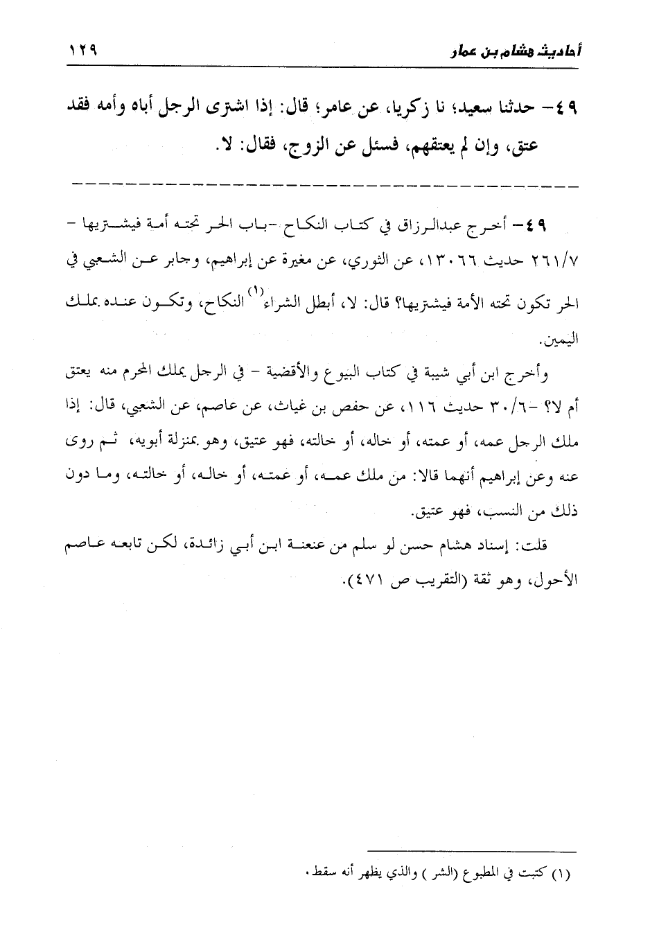 49 - حَدَّثَنَا سَعِيدٌ، نا زَكَرِيَّا، عَنْ عَامِرٍ قَالَ: " §إِذَا اشْتَرَى الرَّجُلُ أَبَاهُ وَأُمَّهُ فَقَدْ عُتِقَ، وَإِنْ لَمْ يُعْتِقْهُمْ، فَسُئِلَ عَنِ الزَّوْجِ، فَقَالَ: لَا "