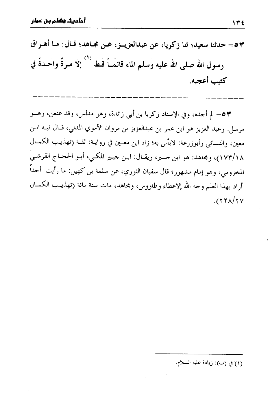 53 - حَدَّثَنَا سَعِيدٌ، ثنا زَكَرِيَّا، عَنْ عَبْدِ الْعَزِيزِ، عَنْ مُجَاهِدٍ قَالَ: «§مَا أَهْرَاقَ رَسُولُ اللَّهِ صَلَّى اللهُ عَلَيْهِ وَسَلَّمَ الْمَاءَ قَائِمًا قَطُّ إِلَّا مَرَّةً وَاحِدَةً فِي كَثِيبٍ أَعْجَبَهُ»