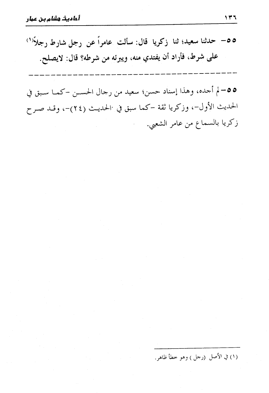 55 - حَدَّثَنَا سَعِيدٌ، ثنا زَكَرِيَّا قَالَ: سَأَلْتُ عَامِرًا عَنْ رَجُلٍ شَارَطَ رَجُلًا عَلَى شَرْطٍ، فَأَرَادَ أَنْ يَفْتَدِيَ مِنْهُ، وَيُبْرِئَهُ مِنْ شَرْطِهِ؟ قَالَ: «§لَا يَصْلُحُ»