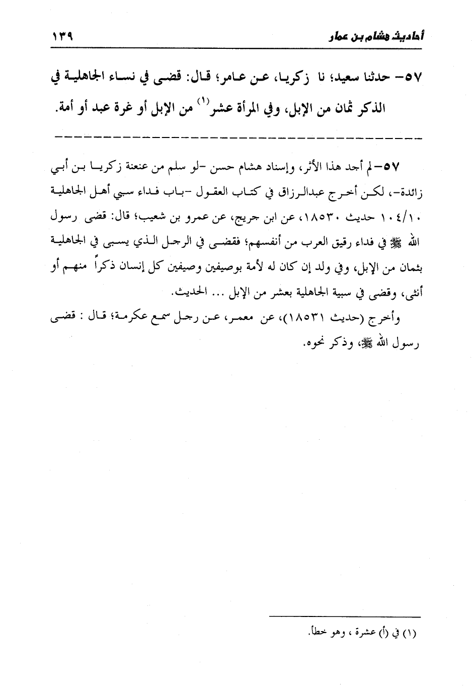 57 - حَدَّثَنَا سَعِيدٌ، نا زَكَرِيَّا، عَنْ عَامِرٍ قَالَ: «§قُضِيَ فِي نِسَاءِ الْجَاهِلِيَّةِ فِي الذَّكَرِ ثَمَانٍ مِنَ الْإِبِلِ، وَفِي الْمَرْأَةِ عَشْرٌ مِنَ الْإِبِلِ، أَوْ غُرَّةُ عَبْدٍ أَوْ أَمَةٍ»