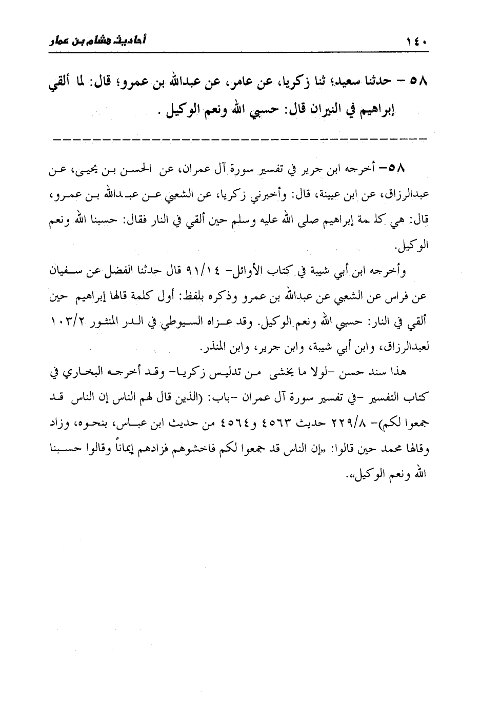 58 - حَدَّثَنَا سَعِيدٌ، ثنا زَكَرِيَّا، عَنْ عَامِرٍ، عَنْ عَبْدِ اللَّهِ بْنِ عَمْرٍو قَالَ: " §لَمَّا أُلْقِيَ إِبْرَاهِيمُ فِي النِّيرَانِ قَالَ: حَسْبِيَ اللَّهُ وَنِعْمَ الْوَكِيلُ "