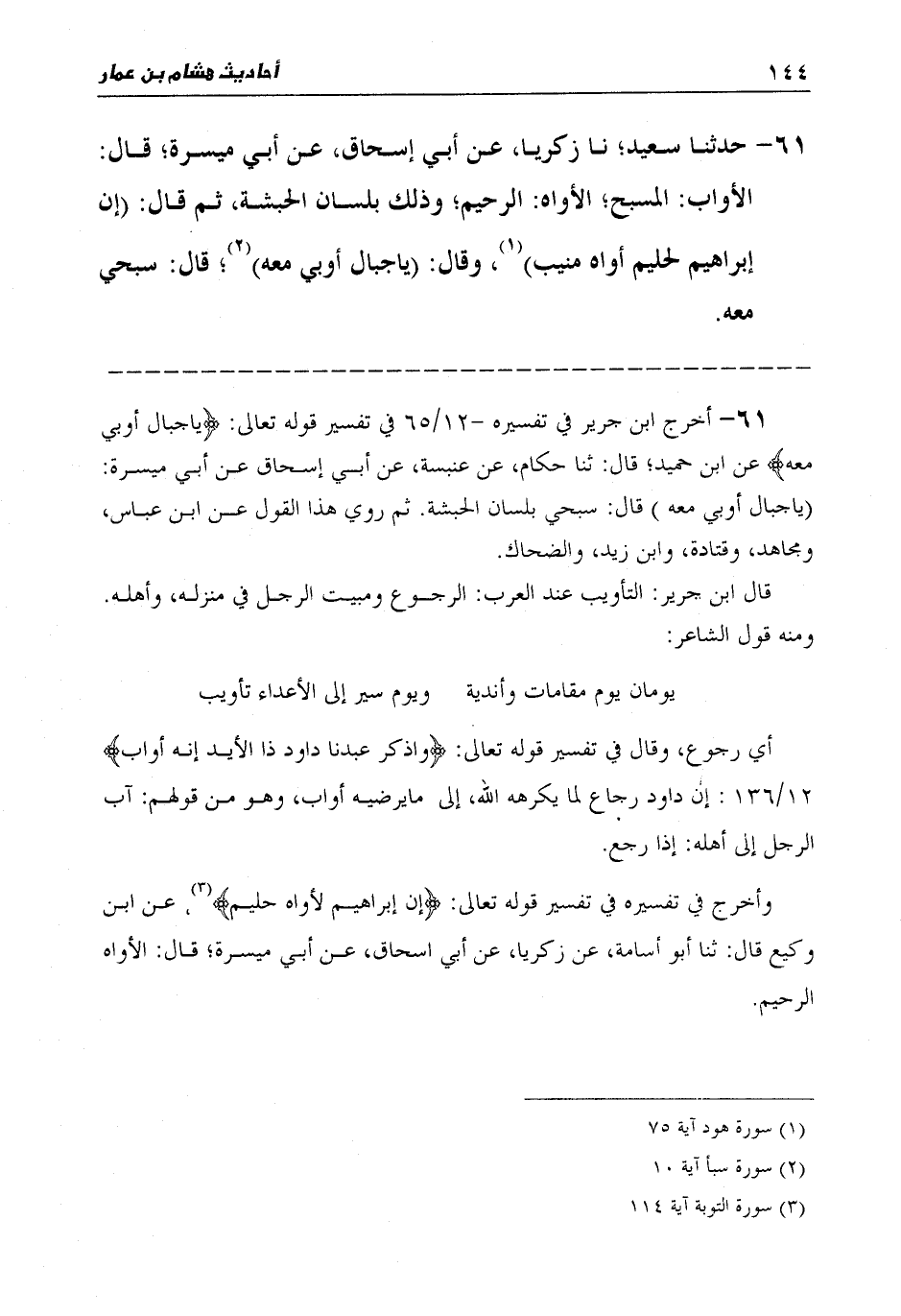 61 - حَدَّثَنَا سَعِيدٌ، نا زَكَرِيَّا، عَنْ أَبِي إِسْحَاقَ، عَنْ أَبِي مَيْسَرَةَ قَالَ: " §الْأَوَّابُ: الْمُسَبِّحُ، الْأَوَّاهُ: الرَّحِيمُ، وَذَلِكَ بِلِسَانِ الْحَبَشَةِ، ثُمَّ قَالَ: {إِنَّ إِبْرَاهِيمَ لَحَلِيمٌ أَوَّاهٌ مُنِيبٌ} [هود: 75] وَقَالَ: {يَا جِبَالُ أَوِّبِي مَعَهُ} [سبأ: 10] قَالَ: سَبِّحِي مَعَهُ "