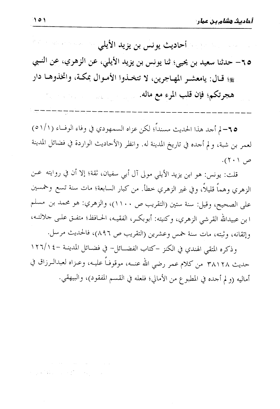 65 - حَدَّثَنَا سَعِيدُ بْنُ يَحْيَى، ثنا يُونُسُ بْنُ يَزِيدَ الْأَيْلِيُّ، عَنِ الزُّهْرِيِّ، عَنِ النَّبِيِّ صَلَّى اللهُ عَلَيْهِ وَسَلَّمَ قَالَ: «يَا مَعْشَرَ الْمُهَاجِرِينَ، §لَا تَتَّخِذُوا الْأَمْوَالَ بِمَكَّةَ، وَاتَّخِذُوهَا دَارَ هِجْرَتِكُمْ، فَإِنَّ قَلْبَ الْمَرْءِ مَعَ مَالِهِ»