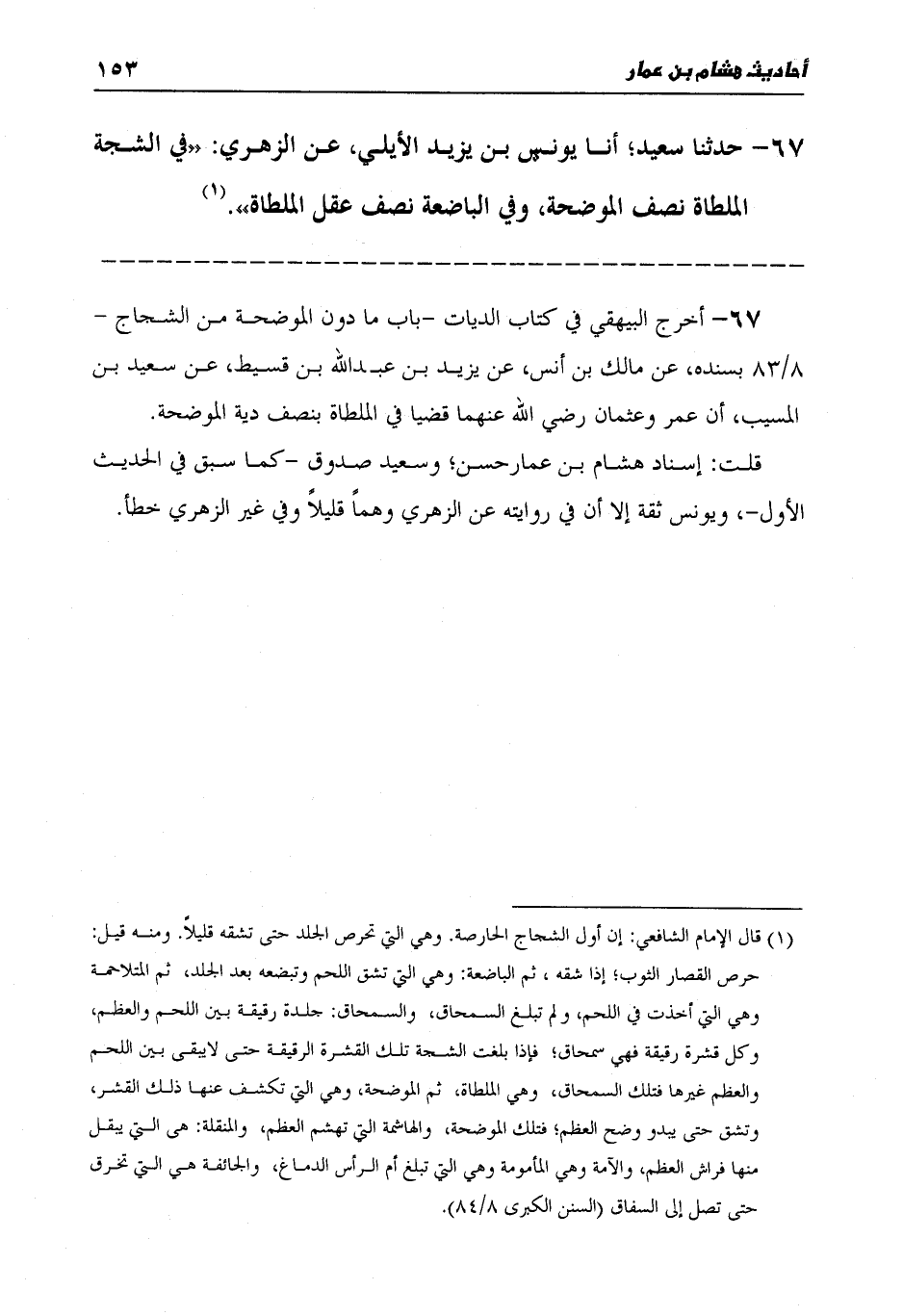 67 - حَدَّثَنَا سَعِيدٌ، أنا يُونُسُ بْنُ يَزِيدَ الْأَيْلِيُّ، عَنِ الزُّهْرِيِّ §فِي الشَّجَّةِ الْمِلْطَاةِ نِصْفُ الْمُوضِحَةِ، وَفِي الْبَاضِعَةِ نِصْفُ عَقْلِ الْمِلْطَاةِ