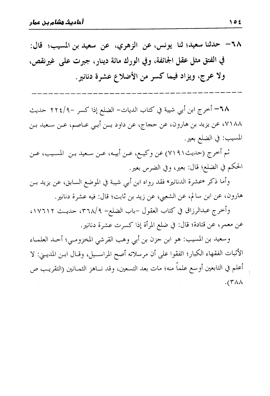 68 - حَدَّثَنَا سَعِيدٌ، ثنا يُونُسُ، عَنِ الزُّهْرِيِّ، عَنْ سَعِيدِ بْنِ الْمُسَيِّبِ قَالَ: «§فِي الْفَتْقِ مِثْلُ عَقْلِ الْجَائِفَةِ، وَفِي الْوِرْكِ مِائَةُ دِينَارٍ، جُبِرَتْ عَلَى غَيْرِ نَقْصٍ، وَلَا عَرَجٍ، وَيُزَادُ فِيمَا كُسِرَ مِنَ الْأَضْلَاعِ عَشْرَةُ دَنَانِيرَ»