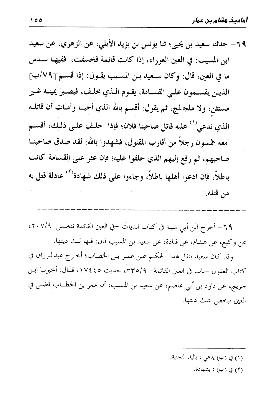 69 - حَدَّثَنَا سَعِيدُ بْنُ يَحْيَى، ثنا يُونُسُ بْنُ يَزِيدَ الْأَيْلِيُّ، عَنِ الزُّهْرِيِّ، عَنْ سَعِيدِ بْنِ الْمُسَيِّبِ §فِي الْعَيْنِ الْعَوْرَاءِ، إِذَا كَانَتْ قَائِمَةً فَخُسِفَتْ، فَفِيهَا سُدُسُ مَا فِي الْعَيْنِ، قَالَ: وَكَانَ سَعِيدُ بْنُ الْمُسَيِّبِ يَقُولُ: إِذَا قَسَمَ الَّذِينَ يُقْسِمُونَ عَلَى الْقَسَامَةِ، يَقُومُ الَّذِي يَحْلِفُ، فَيَصْبِرُ يَمِينَهُ غَيْرَ مُسْتَثْنٍ، وَلَا مُلَجْلَجٍ، ثُمَّ يَقُولُ: أُقْسِمُ بِاللَّهِ الَّذِي أَحْيَا وَأَمَاتَ أَنَّ قَاتِلَهُ الَّذِي نَدِّعِي عَلَيْهِ قَاتِلُ صَاحِبِنَا فُلَانٍ، فَإِذَا حَلَفَ عَلَى ذَلِكَ، أَقْسَمَ مَعَهُ خَمْسُونَ رَجُلًا مِنْ أَقَارِبِ الْمَقْتُولِ، فَشَهِدُوا بِاللَّهِ: لَقَدْ صَدَقَ صَاحِبُنَا صَاحِبَهُمْ، ثُمَّ رَفَعَ إِلَيْهِمُ الَّذِي حَلَفُوا عَلَيْهِ، فَإِنْ عُثِرَ عَلَى الْقَسَامَةِ كَانَتْ بَاطِلًا، فَإِنِ ادَّعَوْا أَهْلَهَا بَاطِلًا، وَجَاءُوا عَلَى ذَلِكَ شَهَادَةً عَادِلَةً قُتِلَ بِهِ مَنْ قَتَلَهُ