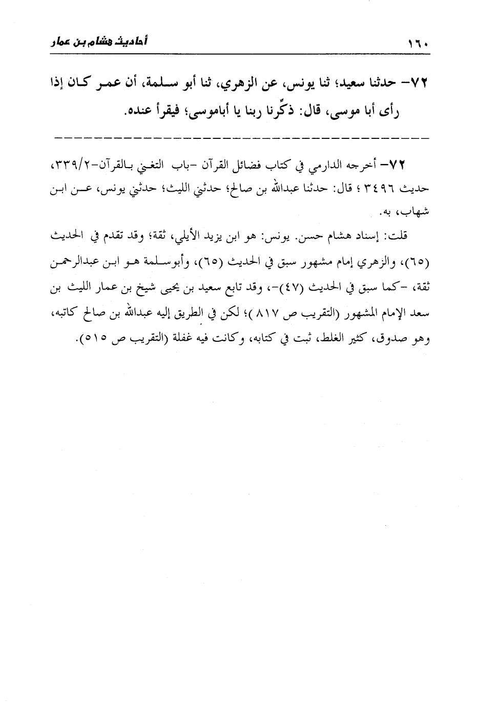 72 - حَدَّثَنَا سَعِيدٌ، ثنا يُونُسُ، عَنِ الزُّهْرِيِّ، ثنا أَبُو سَلَمَةَ، أَنَّ عُمَرَ كَانَ إِذَا رَأَى أَبَا مُوسَى قَالَ: «§ذَكِّرْنَا رَبَّنَا يَا أَبَا مُوسَى، فَيَقْرَأُ عِنْدَهُ»