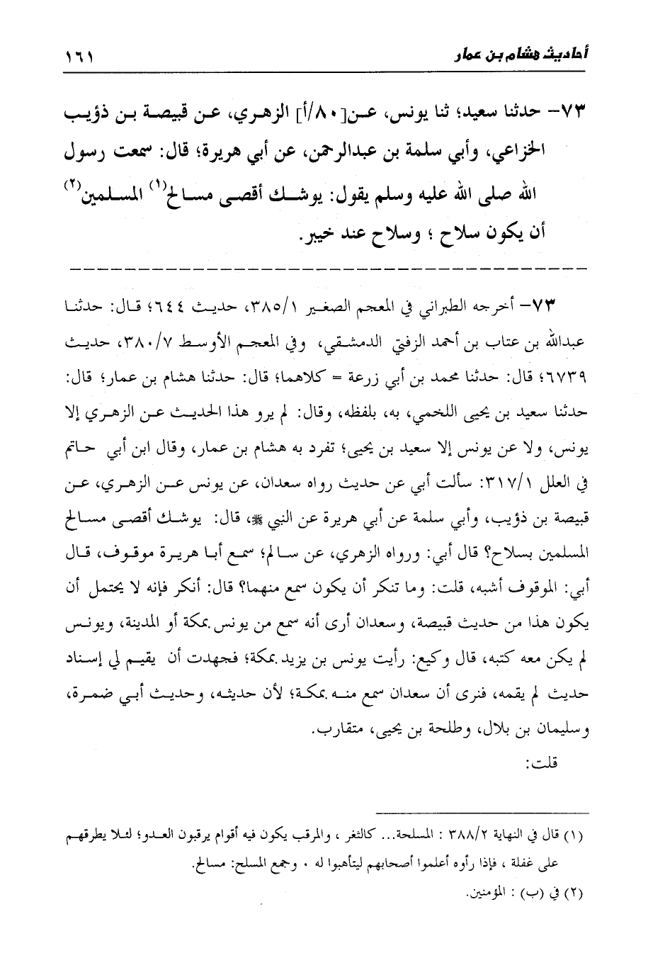 73 - حَدَّثَنَا سَعِيدٌ، ثنا يُونُسُ، عَنِ الزُّهْرِيِّ، عَنْ قَبِيصَةَ بْنِ ذُؤَيْبٍ الْخُزَاعِيِّ، وَأَبِي سَلَمَةَ بْنِ عَبْدِ الرَّحْمَنِ، عَنْ أَبِي هُرَيْرَةَ قَالَ: سَمِعْتُ رَسُولَ اللَّهِ صَلَّى اللهُ عَلَيْهِ وَسَلَّمَ يَقُولُ: «§يُوشِكُ أَقْصَى مَسَالِحِ الْمُسْلِمِينَ أَنْ يَكُونَ سُلَاحٌ، وَسُلَاحٌ عِنْدَ خَيْبَرَ»