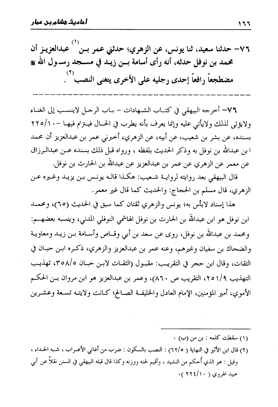 76 - حَدَّثَنَا سَعِيدٌ، ثنا يُونُسُ، عَنِ الزُّهْرِيِّ، حَدَّثَنِي عُمَرُ بْنُ عَبْدِ الْعَزِيزِ، أَنَّ مُحَمَّدَ بْنَ نَوْفَلٍ حَدَّثَهُ §أَنَّهُ رَأَى أُسَامَةَ بْنَ زَيْدٍ فِي مَسْجِدِ رَسُولِ اللَّهِ صَلَّى اللهُ عَلَيْهِ وَسَلَّمَ مُضْطَجِعًا، رَافِعًا إِحْدَى رِجْلَيْهِ عَلَى الْأُخْرَى يَتَغَنَّى النَّصْبَ "