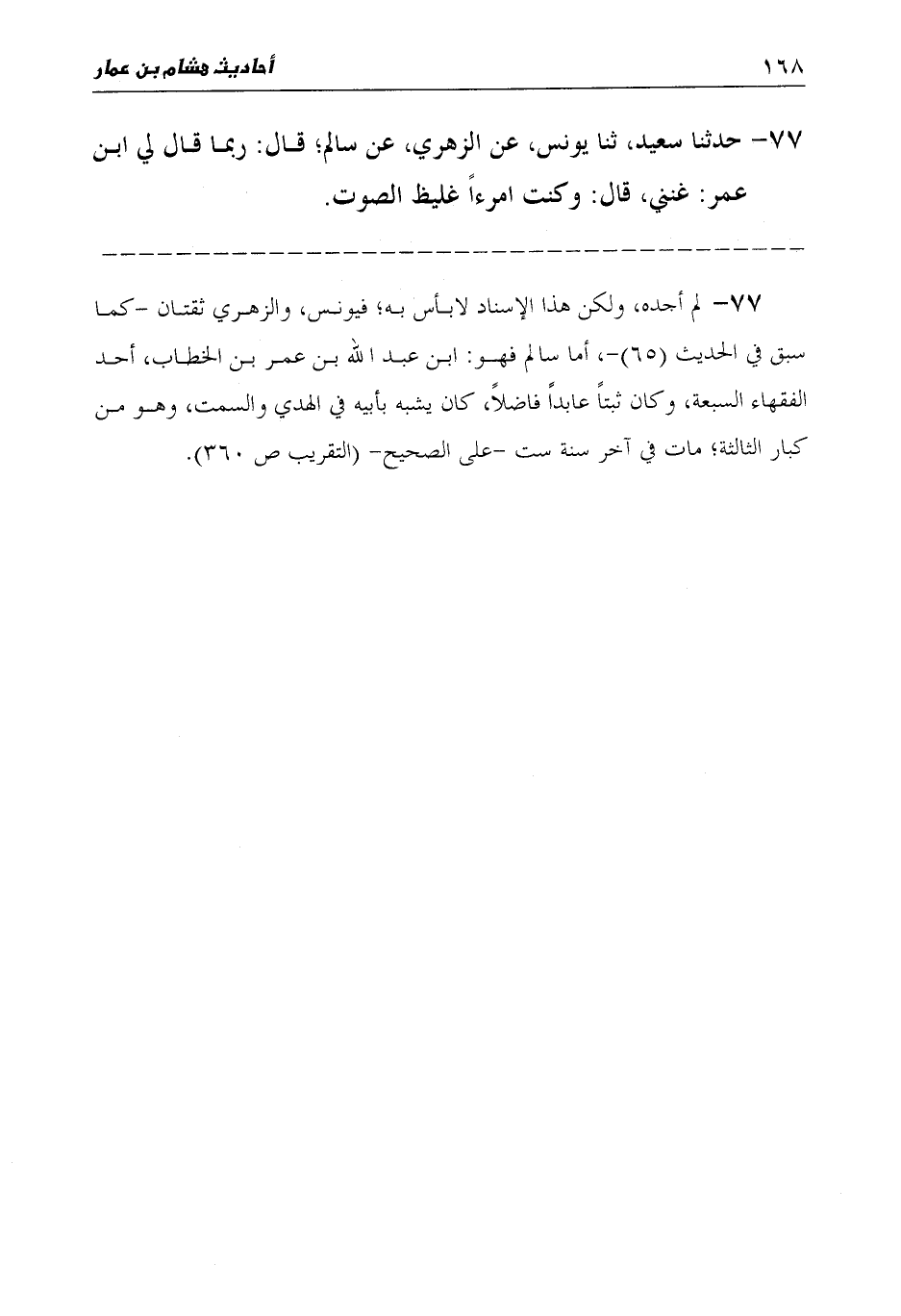 77 - حَدَّثَنَا سَعِيدٌ، ثنا يُونُسُ، عَنِ الزُّهْرِيِّ، عَنْ سَالِمٍ قَالَ: " §رُبَّمَا قَالَ لِي ابْنُ عُمَرَ: غَنِّنِي، قَالَ: وَكُنْتُ امْرَأً غَلِيظَ الصَّوْتِ "