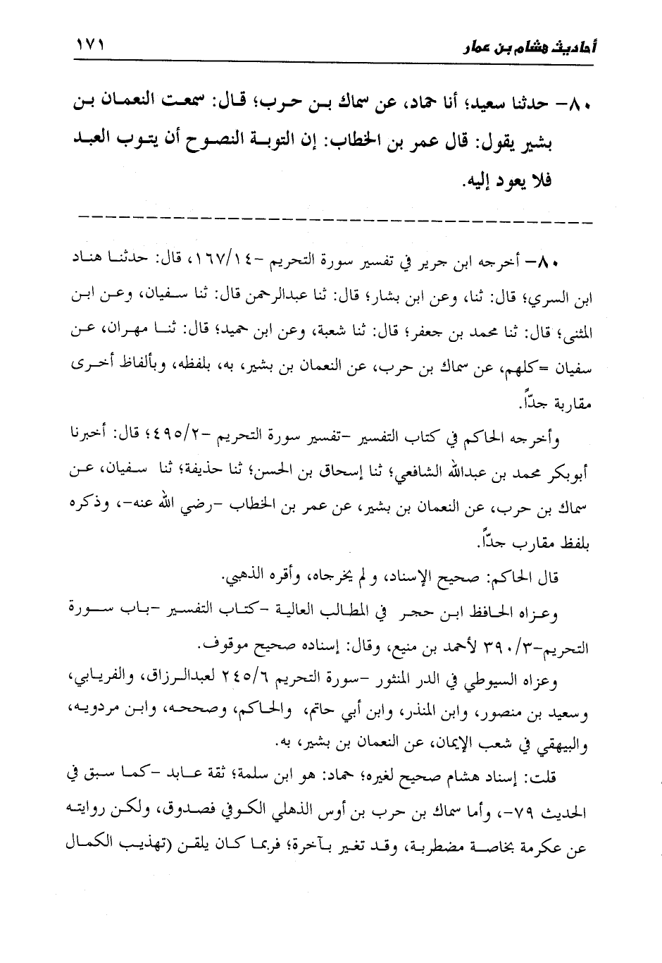 80 - حَدَّثَنَا سَعِيدٌ، أنا حَمَّادٌ، عَنْ سِمَاكِ بْنِ حَرْبٍ قَالَ: سَمِعْتُ النُّعْمَانَ بْنَ بَشِيرٍ يَقُولُ: قَالَ عُمَرُ بْنُ الْخَطَّابِ: «§إِنَّ التَّوْبَةَ النَّصُوحَ أَنْ يَتُوبَ الْعَبْدُ فَلَا يَعُودَ إِلَيْهِ»