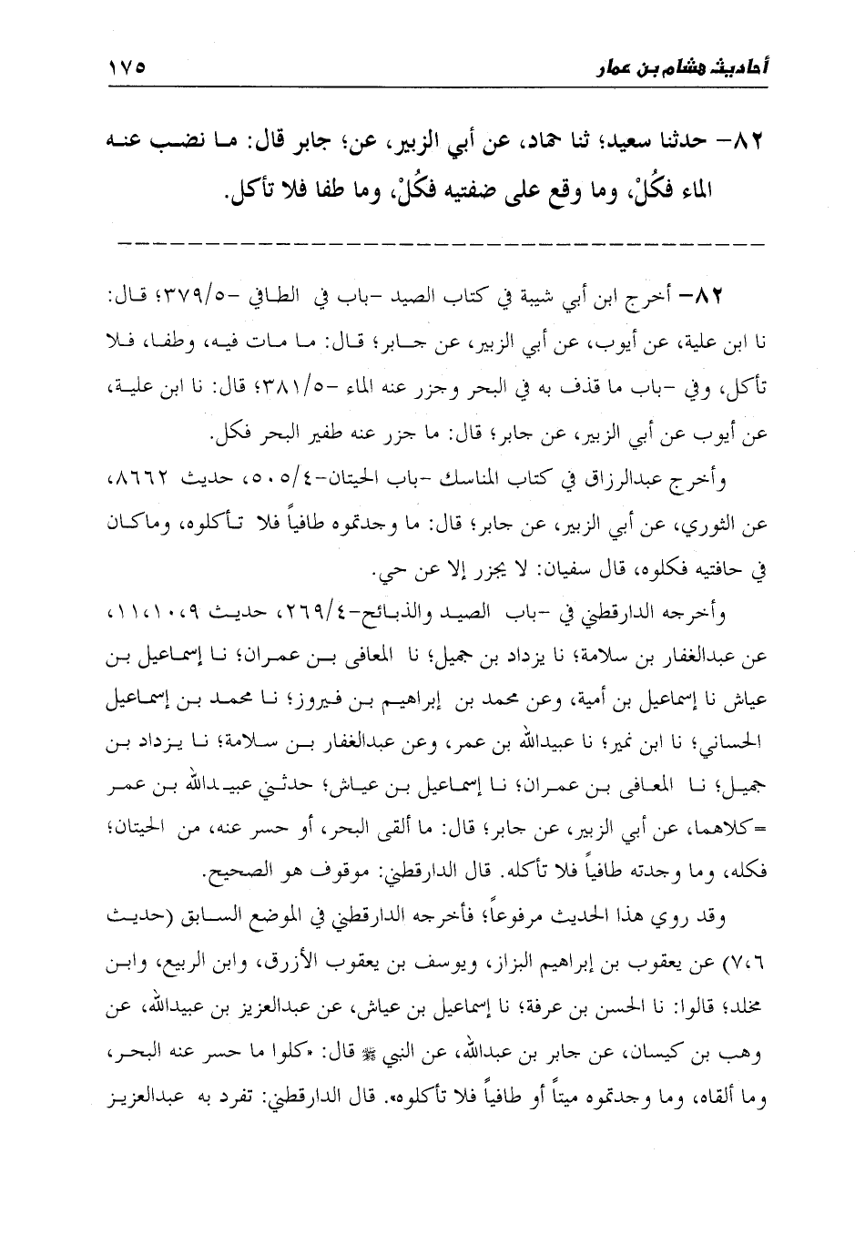 82 - حَدَّثَنَا سَعِيدٌ، ثنا حَمَّادٌ، عَنْ أَبِي الزُّبَيْرِ، عَنْ جَابِرٍ قَالَ: «§مَا نَضَبَ عَنْهُ الْمَاءُ فَكُلْ، وَمَا وَقَعَ عَلَى ضَفَّتَيْهِ فَكُلْ، وَمَا طَفَا فَلَا تَأْكُلْ»