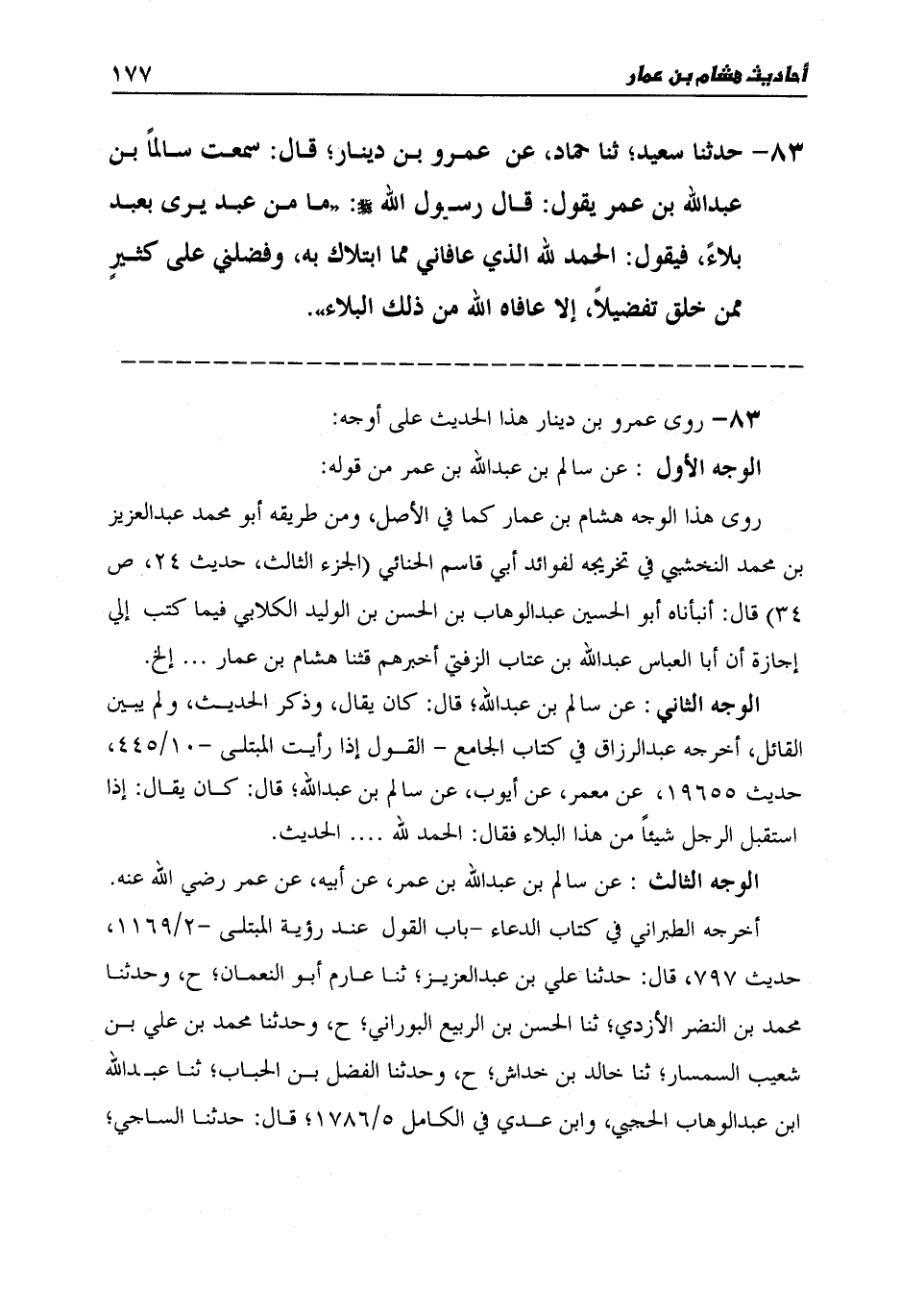 83 - حَدَّثَنَا سَعِيدٌ، ثنا حَمَّادٌ، عَنْ عَمْرِو بْنِ دِينَارٍ، قَالَ: سَمِعْتُ سَالِمَ بْنَ عَبْدِ اللَّهِ بْنِ عُمَرَ يَقُولُ: قَالَ رَسُولُ اللَّهِ صَلَّى اللهُ عَلَيْهِ وَسَلَّمَ: " §مَا مِنْ عَبْدٍ يَرَى بِعَبْدٍ بَلَاءً فَيَقُولُ: الْحَمْدُ لِلَّهِ الَّذِي عَافَانِي مِمَّا ابْتَلَاكَ بِهِ، وَفَضَّلَنِي عَلَى كَثِيرٍ مِمَّنْ خَلَقَ تَفْضِيلًا، إِلَّا عَافَاهُ اللَّهُ مِنْ ذَلِكَ الْبَلَاءِ "