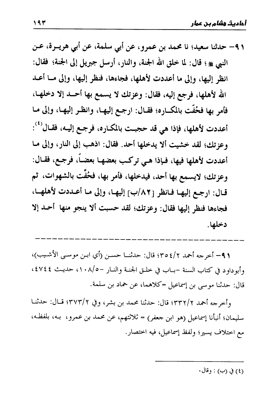 91 - حَدَّثَنَا سَعِيدٌ، نا مُحَمَّدُ بْنُ عَمْرٍو، عَنْ أَبِي سَلَمَةَ، عَنْ أَبِي هُرَيْرَةَ عَنِ النَّبِيِّ صَلَّى اللهُ عَلَيْهِ وَسَلَّمَ قَالَ: " §لَمَّا خَلَقَ اللَّهُ الْجَنَّةَ وَالنَّارَ، أَرْسَلَ جِبْرِيلَ إِلَى الْجَنَّةِ، فَقَالَ: انْظُرْ إِلَيْهَا، وَإِلَى مَا أَعْدَدْتُ لِأَهْلِهَا، فَجَاءَهَا فَنَظَرَ إِلَيْهَا، وَإِلَى مَا أَعَدَّ اللَّهُ لِأَهْلِهَا، فَرَجَعَ إِلَيْهِ فَقَالَ: وَعِزَّتِكَ لَا يَسْمَعُ بِهَا أَحَدٌ إِلَّا دَخَلَهَا، فَأَمَرَ بِهَا فَحُفَّتْ بِالْمَكَارِهِ، فَقَالَ: ارْجِعْ إِلَيْهَا وَانْظُرْ إِلَيْهَا، وَإِلَى مَا أَعْدَدْتُ لِأَهْلِهَا، فَإِذَا هِيَ قَدْ حُجِبَتْ بِالْمَكَارِهِ، فَرَجَعَ إِلَيْهِ فَقَالَ: وَعِزَّتِكَ، لَقَدْ خَشِيتُ أَلَّا يَدْخُلَهَا أَحَدٌ، فَقَالَ: اذْهَبْ إِلَى النَّارِ، وَإِلَى مَا أَعْدَدْتُ لِأَهْلِهَا فِيهَا، فَإِذَا هِيَ تَرْكَبُ بَعْضُهَا بَعْضًا، فَرَجَعَ فَقَالَ: وَعِزَّتِكَ، لَا يَسْمَعُ بِهَا أَحَدٌ فَيَدْخُلُهَا، فَأَمَرَ بِهَا فَحُفَّتْ بِالشَّهَوَاتِ، ثُمَّ قَالَ: ارْجِعْ إِلَيْهَا فَانْظُرْ إِلَيْهَا، وَإِلَى مَا أَعْدَدْتُ لِأَهْلِهَا، فَجَاءَهَا فَنَظَرَ إِلَيْهَا، فَقَالَ: وَعِزَّتِكَ، لَقَدْ حَسِبْتُ أَلَّا يَنْجُوَ مِنْهَا أَحَدٌ إِلَّا دَخَلَهَا "