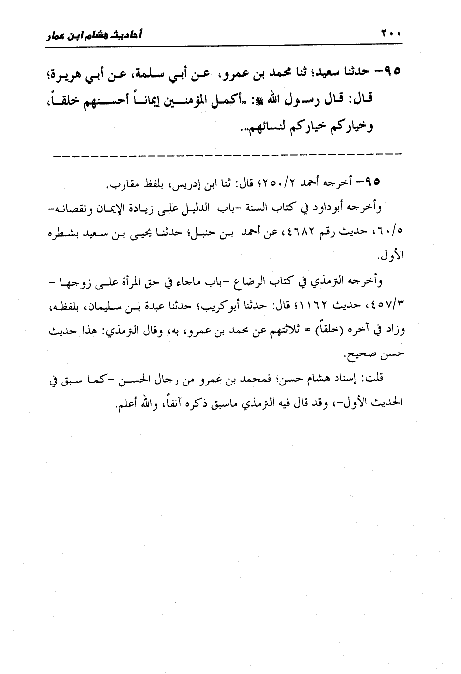 95 - حَدَّثَنَا سَعِيدٌ، ثنا مُحَمَّدُ بْنُ عَمْرٍو، عَنْ أَبِي سَلَمَةَ، عَنْ أَبِي هُرَيْرَةَ قَالَ: قَالَ رَسُولُ اللَّهِ صَلَّى اللهُ عَلَيْهِ وَسَلَّمَ: «§أَكْمَلُ الْمُؤْمِنِينَ إِيمَانًا أَحْسَنُهُمْ خُلُقًا، وَخِيَارُكُمْ خِيَارُكُمْ لِنِسَائِهِمْ»
