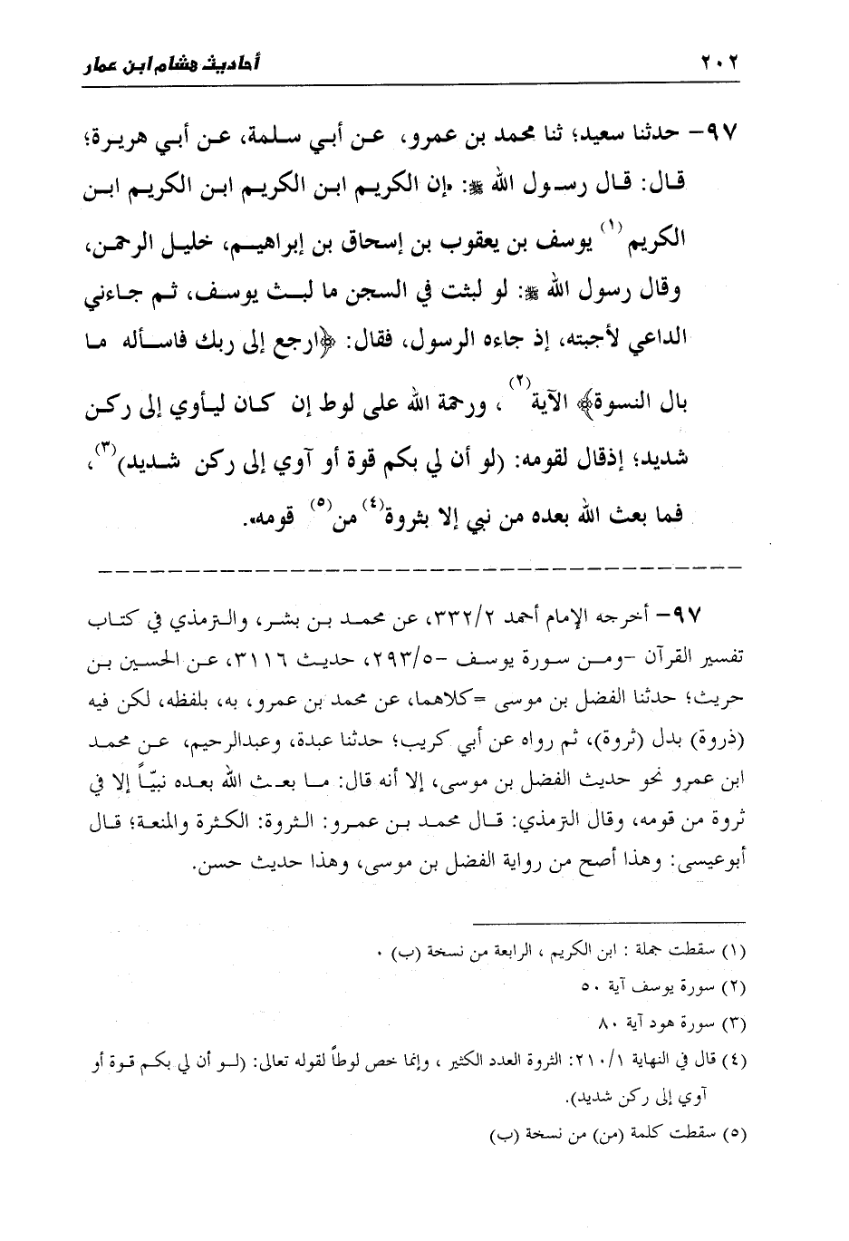 97 - حَدَّثَنَا سَعِيدٌ، ثنا مُحَمَّدُ بْنُ عَمْرٍو، عَنْ أَبِي سَلَمَةَ، عَنْ أَبِي هُرَيْرَةَ قَالَ: قَالَ رَسُولُ اللَّهِ صَلَّى اللهُ عَلَيْهِ وَسَلَّمَ: «§إِنَّ الْكَرِيمَ ابْنَ الْكَرِيمِ ابْنِ الْكَرِيمِ ابْنِ الْكَرِيمِ يُوسُفُ بْنُ يَعْقُوبَ بْنِ إِسْحَاقَ بْنِ إِبْرَاهِيمَ خَلِيلِ الرَّحْمَنِ» ، وَقَالَ رَسُولُ اللَّهِ صَلَّى اللهُ عَلَيْهِ وَسَلَّمَ: " لَوْ لَبِثْتُ فِي السِّجْنِ مَا لَبِثَ يُوسُفُ، ثُمَّ جَاءَنِي الدَّاعِي لَأَجَبْتُهُ، إِذْ جَاءَهُ الرَّسُولُ فَقَالَ: {ارْجِعْ إِلَى رَبِّكِ فَاسْأَلْهُ مَا بَالُ النِّسْوَةِ} [يوسف: 50] الْآيَةَ، وَرَحْمَةُ اللَّهِ عَلَى لُوطٍ، إِنْ كَانَ لَيَأْوِي إِلَى رُكْنٍ شَدِيدٍ، إِذْ قَالَ لِقَوْمِهِ: {لَوْ أَنَّ لِيَ بِكُمْ قُوَّةً أَوْ آوِي إِلَى رُكْنٍ شَدِيدٍ} [هود: 80] ، فَمَا بَعَثَ اللَّهُ بَعْدَهُ مِنْ نَبِيٍّ إِلَّا بِثَرْوَةٍ مِنْ قَوْمِهِ "