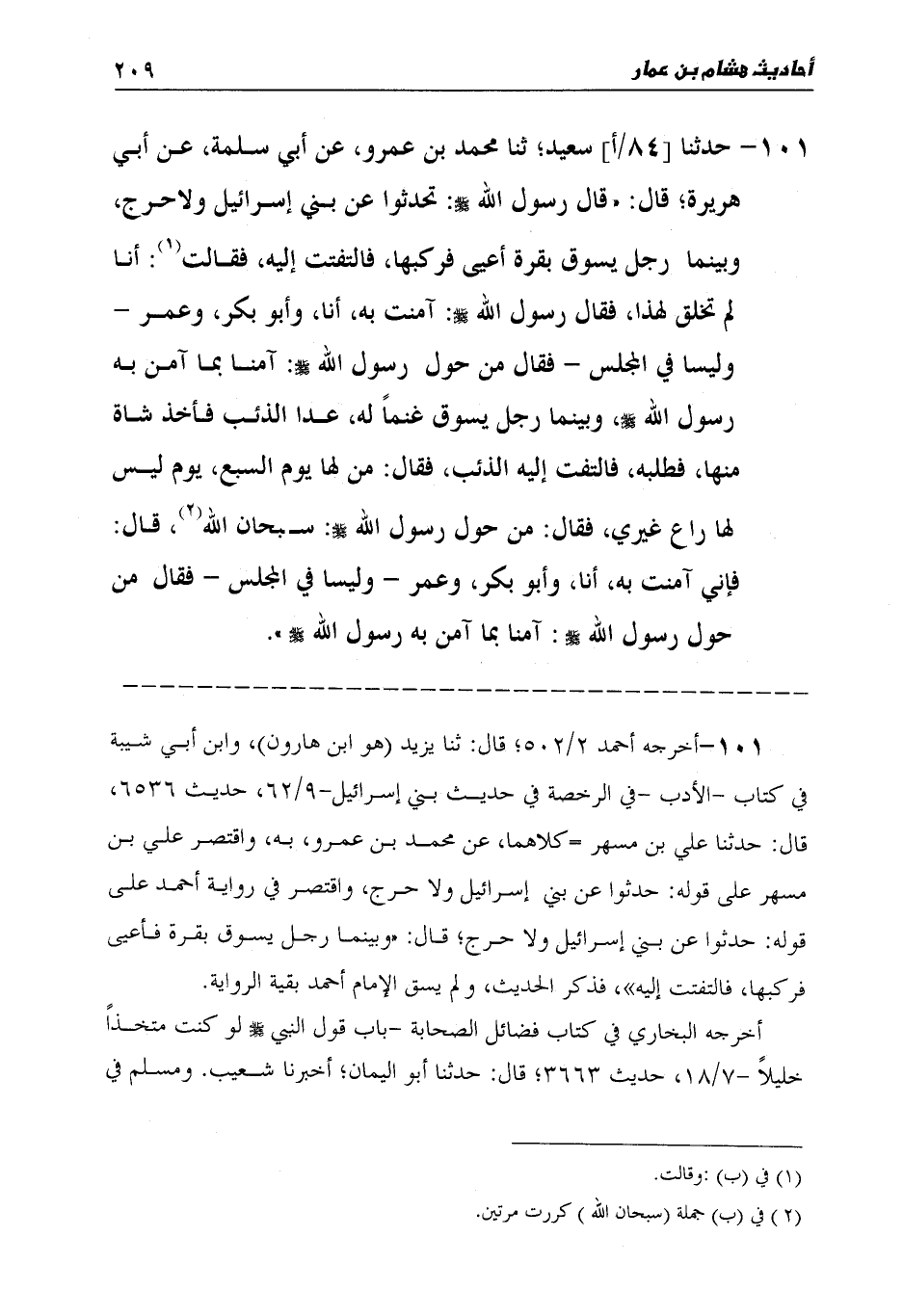 101 - حَدَّثَنَا سَعِيدٌ، ثنا مُحَمَّدُ بْنُ عَمْرٍو، عَنْ أَبِي سَلَمَةَ، عَنْ أَبِي هُرَيْرَةَ قَالَ: قَالَ رَسُولُ اللَّهِ صَلَّى اللهُ عَلَيْهِ وَسَلَّمَ: " §تَحَدَّثُوا عَنْ بَنِي إِسْرَائِيلَ وَلَا حَرَجَ، وَبَيْنَمَا رَجُلٌ يَسُوقُ بَقَرَةً أَعْيَا فَرَكِبَهَا، فَالْتَفَتَتْ إِلَيْهِ، فَقَالَتْ: أَنَا لَمْ أُخْلَقْ لِهَذَا، فَقَالَ رَسُولُ اللَّهِ صَلَّى اللهُ عَلَيْهِ وَسَلَّمَ: آمَنْتُ بِهِ أَنَا، وَأَبُو بَكْرٍ، وَعُمَرُ " - وَلَيْسَا فِي الْمَجْلِسِ - فَقَالَ مَنْ حَوْلَ رَسُولِ اللَّهِ صَلَّى اللهُ عَلَيْهِ وَسَلَّمَ: آمَنَّا بِمَا آمَنَ بِهِ رَسُولُ اللَّهِ صَلَّى اللهُ عَلَيْهِ وَسَلَّمَ، وَبَيْنَمَا رَجُلٌ يَسُوقُ غَنَمًا لَهُ عَدَا الذِّئْبُ فَأَخَذَ شَاةً مِنْهَا، فَطَلَبَهُ، فَالْتَفَتَ إِلَيْهِ الذِّئْبُ فَقَالَ: مَنْ لَهَا يَوْمَ السَّبُعِ يَوْمَ لَيْسَ لَهَا رَاعٍ غَيْرِي، فَقَالَ مَنْ حَوْلَ رَسُولِ اللَّهِ صَلَّى اللهُ عَلَيْهِ وَسَلَّمَ: سُبْحَانَ اللَّهِ، قَالَ: «فَإِنِّي آمَنْتُ بِهِ أَنَا، وَأَبُو بَكْرٍ، وَعُمَرُ» - وَلَيْسَا فِي الْمَجْلِسِ - فَقَالَ مَنْ حَوْلَ رَسُولِ اللَّهِ صَلَّى اللهُ عَلَيْهِ وَسَلَّمَ: آمَنَّا بِمَا آمَنَ بِهِ رَسُولُ اللَّهِ صَلَّى اللهُ عَلَيْهِ وَسَلَّمَ "