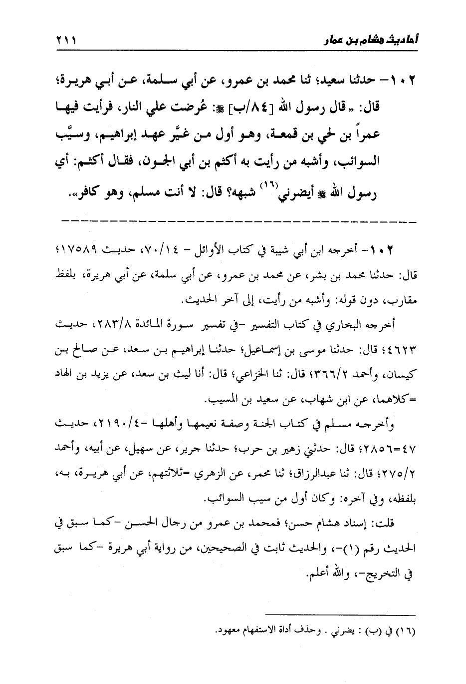 102 - حَدَّثَنَا سَعِيدٌ، ثنا مُحَمَّدُ بْنُ عَمْرٍو، عَنْ أَبِي سَلَمَةَ، عَنْ أَبِي هُرَيْرَةَ قَالَ: قَالَ رَسُولُ اللَّهِ صَلَّى اللهُ عَلَيْهِ وَسَلَّمَ: «§عُرِضَتْ عَلَيَّ النَّارُ، فَرَأَيْتُ فِيهَا عَمْرَو بْنَ لُحَيِّ بْنِ قَمَعَةَ، وَهُوَ أَوَّلُ مَنْ غَيَّرَ عَهْدَ إِبْرَاهِيمَ، وَسَيَّبَ السَّوَائِبَ، وَأَشْبَهُ مَنْ رَأَيْتُ بِهِ أَكْثَمُ بْنُ أَبِي الْجَوْنِ» ، فَقَالَ أَكْثَمُ: أَيْ رَسُولَ اللَّهِ، صَلَّى اللهُ عَلَيْهِ وَسَلَّمَ، أَيَضُرُّنِي شَبَهُهُ؟ قَالَ: «لَا أَنْتَ مُسْلِمٌ، وَهُوَ كَافِرٌ»