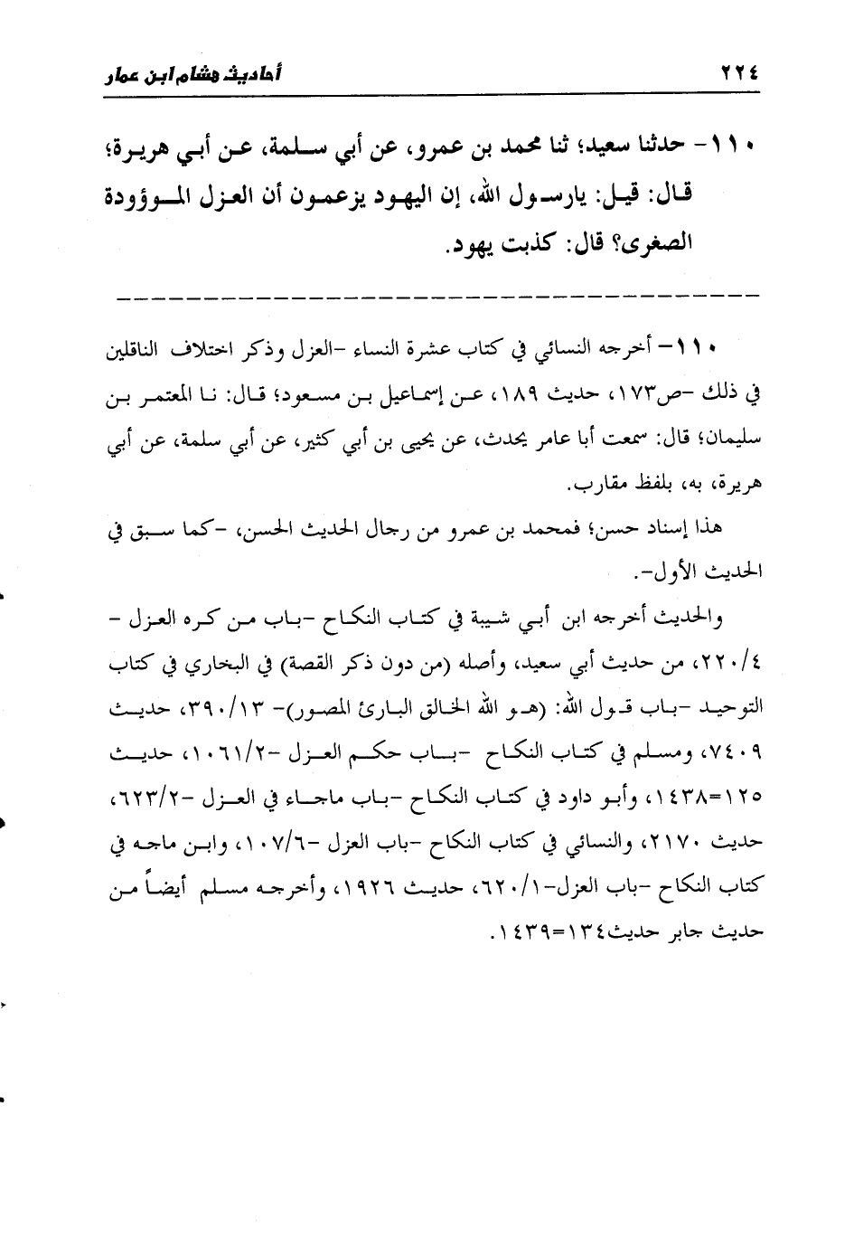 110 - حَدَّثَنَا سَعِيدٌ، ثنا مُحَمَّدُ بْنُ عَمْرٍو، عَنْ أَبِي سَلَمَةَ، عَنْ أَبِي هُرَيْرَةَ قَالَ: §قِيلَ: يَا رَسُولَ اللَّهِ، إِنَّ الْيَهُودَ يَزْعُمُونَ أَنَّ الْعَزْلَ الْمَوْءُودَةُ الصُّغْرَى؟ قَالَ: «كَذَبَتْ يَهُودُ»