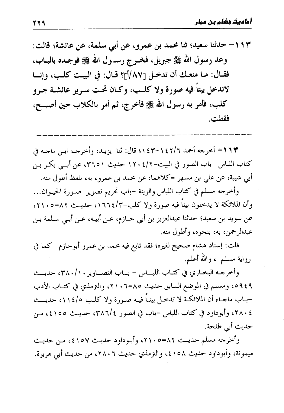 113 - حَدَّثَنَا سَعِيدٌ، ثنا مُحَمَّدُ بْنُ عَمْرٍو، عَنْ أَبِي سَلَمَةَ، عَنْ عَائِشَةَ قَالَتْ: وَعَدَ رَسُولَ اللَّهِ صَلَّى اللهُ عَلَيْهِ وَسَلَّمَ جِبْرِيلُ، فَخَرَجَ رَسُولُ اللَّهِ صَلَّى اللهُ عَلَيْهِ وَسَلَّمَ فَوَجَدَهُ بِالْبَابِ، فَقَالَ: «§مَا مَنَعَكَ أَنْ تَدْخُلَ؟» قَالَ: فِي الْبَيْتِ كَلْبٌ، وَإِنَّا لَا نَدْخُلُ بَيْتًا فِيهِ صُورَةٌ وَلَا كَلْبٌ «، وَكَانَ تَحْتَ سَرِيرِ عَائِشَةَ جِرْوُ كَلْبٍ، فَأَمَرَ بِهِ رَسُولُ اللَّهِ صَلَّى اللهُ عَلَيْهِ وَسَلَّمَ فَأُخْرِجَ، ثُمَّ أَمَرَ بِالْكِلَابِ حِينَ أَصْبَحَ فَقُتِلَتْ»