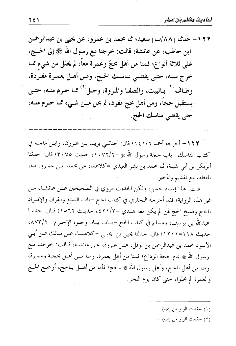 122 - حَدَّثَنَا سَعِيدٌ، ثنا مُحَمَّدُ بْنُ عَمْرٍو، عَنْ يَحْيَى بْنِ عَبْدِ الرَّحْمَنِ بْنِ حَاطِبٍ، عَنْ عَائِشَةَ قَالَتْ: " §خَرَجْنَا مَعَ رَسُولِ اللَّهِ صَلَّى اللهُ عَلَيْهِ وَسَلَّمَ إِلَى الْحَجِّ، عَلَى ثَلَاثَةِ أَنْوَاعٍ: فَمِنَّا مِنْ أَهَلَّ بِحَجٍّ وَعُمْرَةٍ مَعًا، لَمْ يَحْلِلْ مِنْ شَيْءٍ مِمَّا خَرَجَ مِنْهُ حَتَّى يَقْضِيَ مَنَاسِكَ الْحَجِّ، وَمَنْ أَهَلَّ بِعُمْرَةٍ مُفْرَدَةٍ، وَطَافَ بِالْبَيْتِ، وَالصَّفَا وَالْمَرْوَةِ، وَحَلَّ مِمَّا حَرُمَ مِنْهُ، حَتَّى يَسْتَقْبِلَ حَجًّا، وَمَنْ أَهَلَّ بِحَجٍّ مُفْرَدٍ، لَمْ يَحِلَّ مِنْ شَيْءٍ مِمَّا حَرُمَ مِنْهُ، حَتَّى يَقْضِيَ مَنَاسِكَ الْحَجِّ "