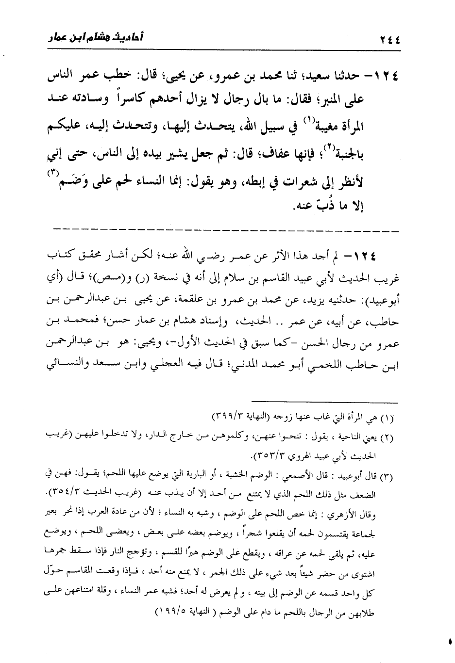 124 - حَدَّثَنَا سَعِيدٌ، ثنا مُحَمَّدُ بْنُ عَمْرٍو، عَنْ يَحْيَى قَالَ: خَطَبَ عُمَرُ النَّاسَ عَلَى الْمِنْبَرِ، فَقَالَ: " §مَا بَالُ رِجَالٍ لَا يَزَالُ أَحَدُهُمْ كَاسِرًا وِسَادَتَهُ عِنْدَ الْمَرْأَةِ مُغَيَّبَةٍ فِي سَبِيلِ اللَّهِ، يَتَحَدَّثُ إِلَيْهَا، وَتَتَحَدَّثُ إِلَيْهِ، عَلَيْكُمْ بَالْجَنَبَةِ، فَإِنَّهَا عَفَافٌ، قَالَ: ثُمَّ جَعَلَ يُشِيرُ بِيَدِهِ إِلَى النَّاسِ، حَتَّى إِنِّي لَأَنْظُرُ إِلَى شَعَرَاتٍ فِي إِبْطِهِ، وَهُوَ يَقُولُ: إِنَّمَا النِّسَاءُ لَحْمٌ عَلَى وَضَمٍ إِلَّا مَا ذُبَّ عَنْهُ "