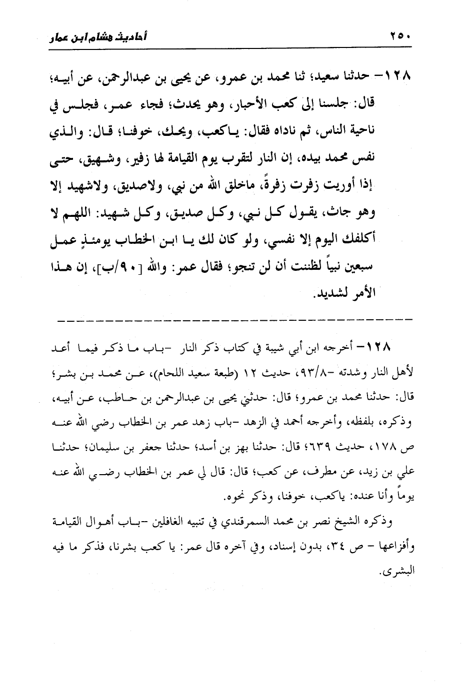 128 - حَدَّثَنَا سَعِيدٌ، ثنا مُحَمَّدُ بْنُ عَمْرٍو، عَنْ يَحْيَى بْنِ عَبْدِ الرَّحْمَنِ، عَنْ أَبِيهِ قَالَ: جَلَسْنَا إِلَى كَعْبِ الْأَحْبَارِ وَهُوَ يُحَدِّثُ، فَجَاءَ عُمَرُ فَجَلَسَ فِي نَاحِيَةِ النَّاسِ، ثُمَّ نَادَاهُ، فَقَالَ: يَا كَعْبُ، وَيْحَكَ خَوِّفْنَا، قَالَ: وَالَّذِي نَفْسُ مُحَمَّدٍ بِيَدِهِ، §إِنَّ النَّارَ لَتَقْرَبُ يَوْمَ الْقِيَامَةِ لَهَا زَفِيرٌ وَشَهِيقٌ، حَتَّى إِذَا أَورِيَتْ زَفَرَتْ زَفْرَةً، مَا خَلَقَ اللَّهُ مِنْ نَبِيٍّ، وَلَا صِدِّيقٍ، وَلَا شَهِيدٍ إِلَّا وَهُوَ جَاثٍ، يَقُولُ: كُلُّ نَبِيٍّ، وَكُلُّ صِدِّيقٍ، وَكُلُّ شَهِيدٍ: اللَّهُمَّ لَا أُكَلِّفُكَ الْيَوْمَ إِلَّا نَفْسِي، وَلَوْ كَانَ لَكَ يَا ابْنَ الْخَطَّابِ يَوْمَئِذٍ عَمَلُ سَبْعِينَ نَبِيًّا لَظَنَنْتَ أَنْ لَنْ تَنْجُوَ، فَقَالَ عُمَرُ: وَاللَّهِ، إِنَّ هَذَا الْأَمْرَ لَشَدِيدٌ "