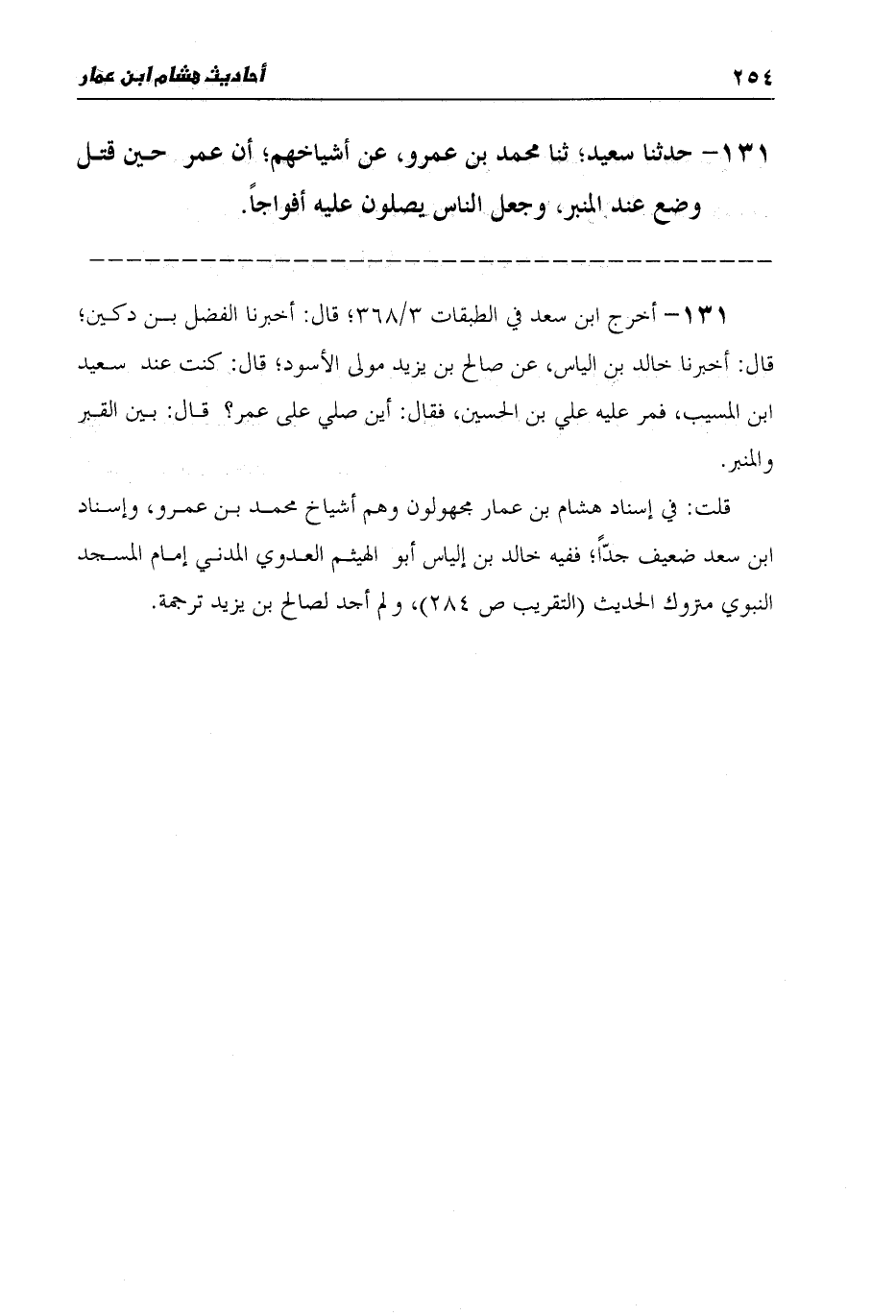 131 - حَدَّثَنَا سَعِيدٌ، ثنا مُحَمَّدُ بْنُ عَمْرٍو، عَنْ أَشْيَاخِهِمْ «§أَنَّ عُمَرَ، حِينَ قُتِلَ وُضِعَ عِنْدَ الْمِنْبَرِ، وَجَعَلَ النَّاسُ يُصَلُّونَ عَلَيْهِ أَفْوَاجًا»