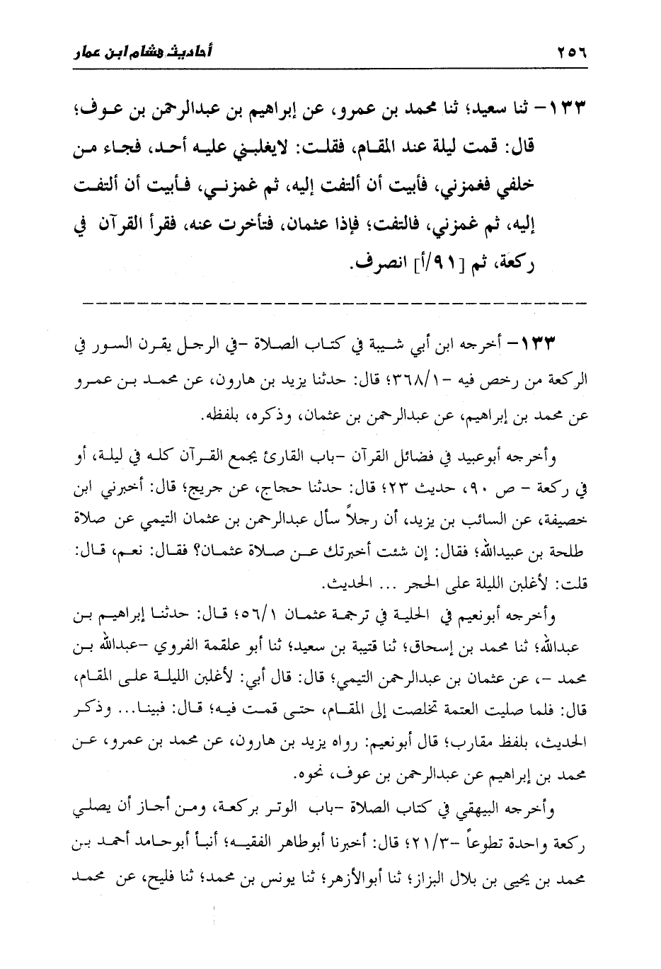 133 - ثنا سَعِيدٌ، ثنا مُحَمَّدُ بْنُ عَمْرٍو، عَنْ إِبْرَاهِيمَ بْنِ عَبْدِ الرَّحْمَنِ بْنِ عَوْفٍ قَالَ: " §قُمْتُ لَيْلَةً عِنْدَ الْمَقَامِ، فَقُلْتُ: لَا يَغْلِبُنِي عَلَيْهِ أَحَدٌ، فَجَاءَ مِنْ خَلْفِي فَغَمَزَنِي، فَأَبَيْتُ أَنْ أَلْتَفِتَ إِلَيْهِ، ثُمَّ غَمَزَنِي، فَأَبَيْتُ أَنْ أَلْتَفِتَ إِلَيْهِ، ثُمَّ غَمَزَنِي فَالْتَفَتُّ، فَإِذَا عُثْمَانُ، فَتَأَخَّرْتُ عَنْهُ، فَقَرَأَ الْقُرْآنَ فِي رَكْعَةٍ، ثُمَّ انْصَرَفَ "