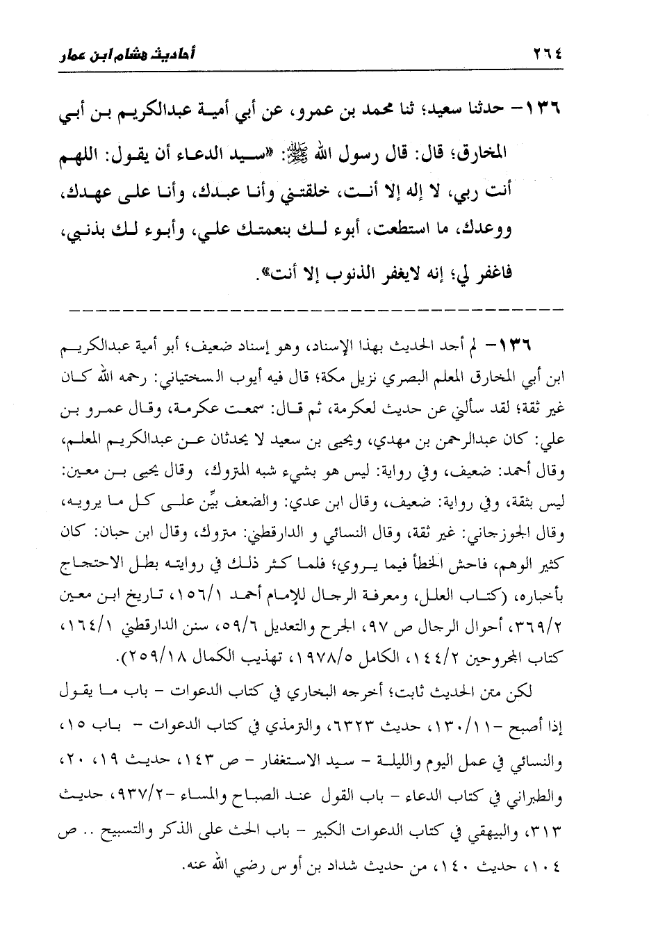 حَدَّثَنَا سَعِيدٌ، ثنا مُحَمَّدُ بْنُ عَمْرٍو، عَنْ أَبِي أُمَيَّةَ عَبْدِ الْكَرِيمِ بْنِ أَبِي الْمُخَارِقِ قَالَ: قَالَ رَسُولُ اللَّهِ صَلَّى اللهُ عَلَيْهِ وَسَلَّمَ: " §سَيِّدُ الدُّعَاءِ أَنْ يَقُولَ: اللَّهُمَّ أَنْتَ رَبِّي، لَا إِلَهَ إِلَّا أَنْتَ، خَلَقْتَنِي وَأَنَا عَبْدُكَ، وَأَنَا عَلَى عَهْدِكَ وَوَعْدُكَ مَا اسْتَطَعْتُ، أَبُوءُ لَكَ بِنِعْمَتِكَ عَلَيَّ، وَأَبُوءُ لَكَ بِذَنْبِي، فَاغْفِرْ لِي، إِنَّهُ لَا يَغْفِرُ الذُّنُوبَ إِلَّا أَنْتَ "