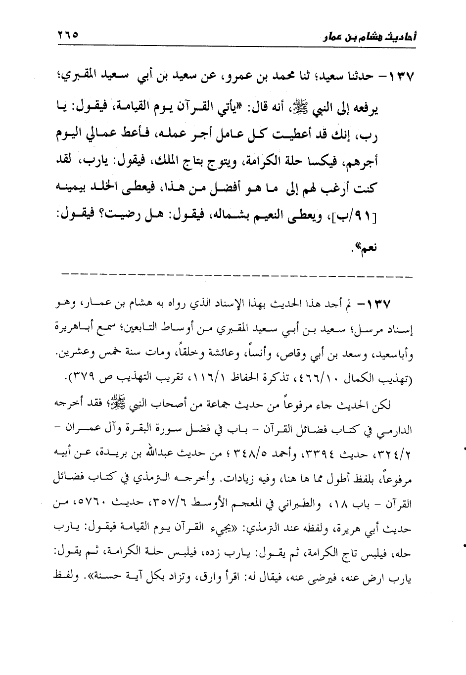 137 - حَدَّثَنَا سَعِيدٌ، ثنا مُحَمَّدُ بْنُ عَمْرٍو، عَنْ سَعِيدِ بْنِ أَبِي سَعِيدٍ الْمَقْبُرِيِّ، يَرْفَعُهُ إِلَى النَّبِيِّ صَلَّى اللهُ عَلَيْهِ وَسَلَّمَ أَنَّهُ قَالَ: " §يَأْتِي الْقُرْآنُ يَوْمَ الْقِيَامَةِ، فَيَقُولُ: يَا رَبِّ، إِنَّكَ قَدْ أَعْطَيْتَ كُلَّ عَامِلٍ أَجْرَ عَمَلِهِ، فَأَعْطِ عُمَّالِي الْيَوْمَ أَجْرَهُمْ، فَيُكْسَا حُلَّةَ الْكَرَامَةِ، وَيُتَوَّجُ بِتَاجِ الْمُلْكِ، فَيَقُولُ: يَا رَبِّ، لَقَدْ كُنْتُ أَرْغَبُ لَهُمْ إِلَى مَا هُوَ أَفْضَلُ مِنْ هَذَا، فَيُعْطَى الْخُلْدَ بِيَمِينِهِ، وَيُعْطَى النَّعِيمَ بِشِمَالِهِ، فَيَقُولُ: هَلْ رَضِيتَ؟ فَيَقُولُ: نَعَمْ "