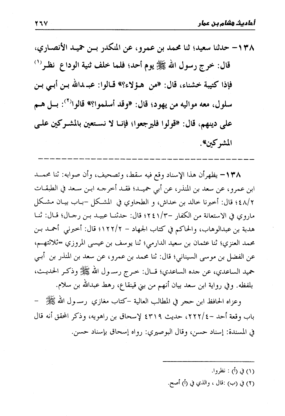 138 - حَدَّثَنَا سَعِيدٌ، ثنا مُحَمَّدُ بْنُ عَمْرٍو، عَنِ الْمُنْكَدِرِ بْنِ حُمَيْدٍ الْأَنْصَارِيِّ قَالَ: خَرَجَ رَسُولُ اللَّهِ صَلَّى اللهُ عَلَيْهِ وَسَلَّمَ يَوْمَ أُحُدٍ، فَلَمَّا خَلَّفَ ثَنِيَّةَ الْوَدَاعِ نَظَرَ فَإِذَا كَتِيبَةٌ خَشْنَاءُ، قَالَ: «مَنْ هَؤُلَاءِ؟» ، قَالُوا: عَبْدُ اللَّهِ بْنُ أُبَيِّ بْنِ سَلُولٍ مَعَهُ مَوَالِيهِ مِنْ يَهُودٍ، قَالَ: «وَقَدْ أَسْلَمُوا؟» قَالُوا: بَلْ هُمْ عَلَى دِينِهِمْ قَالَ: «§قُولُوا فَلْيَرْجِعُوا، فَإِنَّا لَا نَسْتَعِينُ بِالْمُشْرِكِينَ عَلَى الْمُشْرِكِينَ»